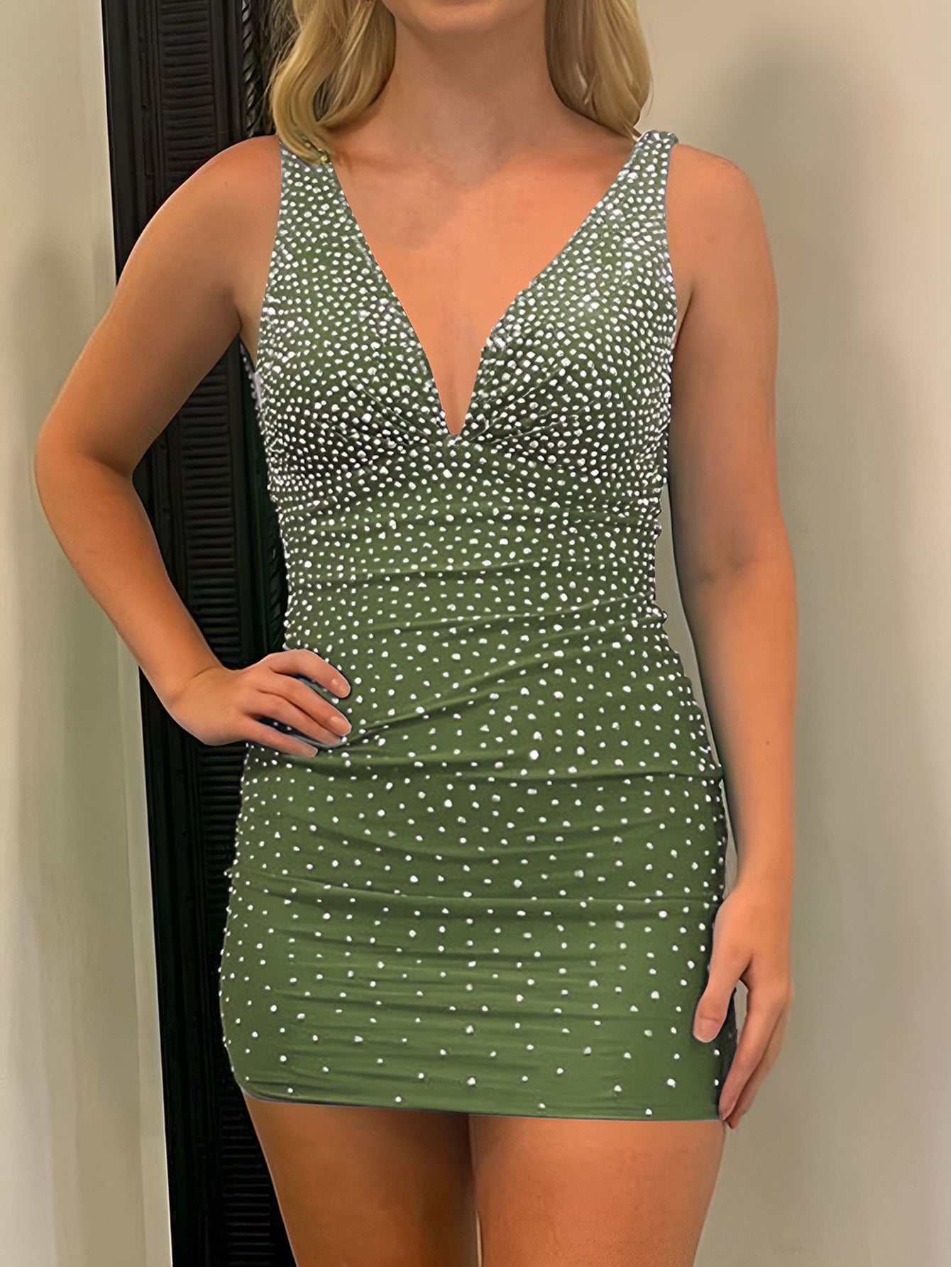 Hot Fix Deep V-Neck Sheath Mini Prom Dress - Sage Green