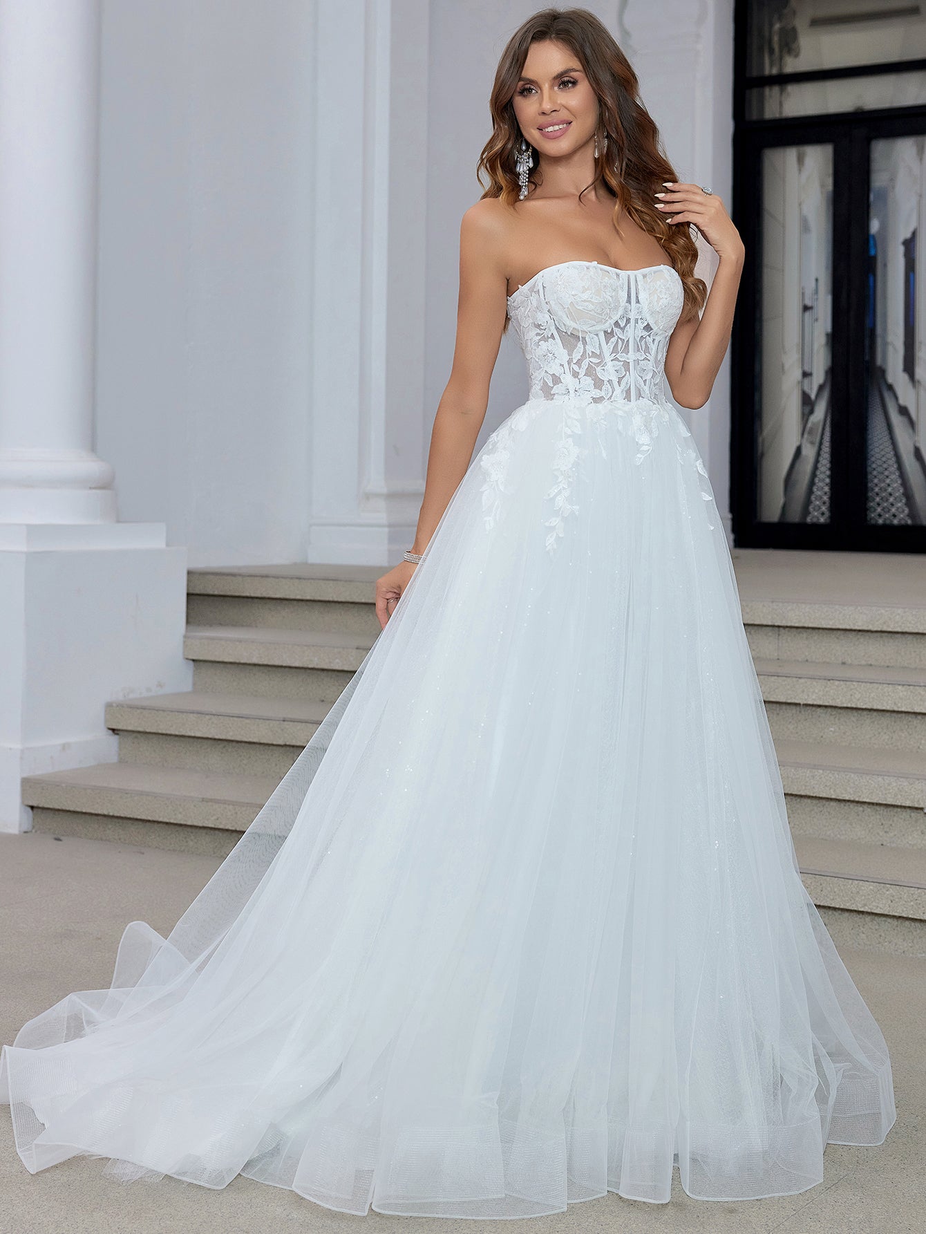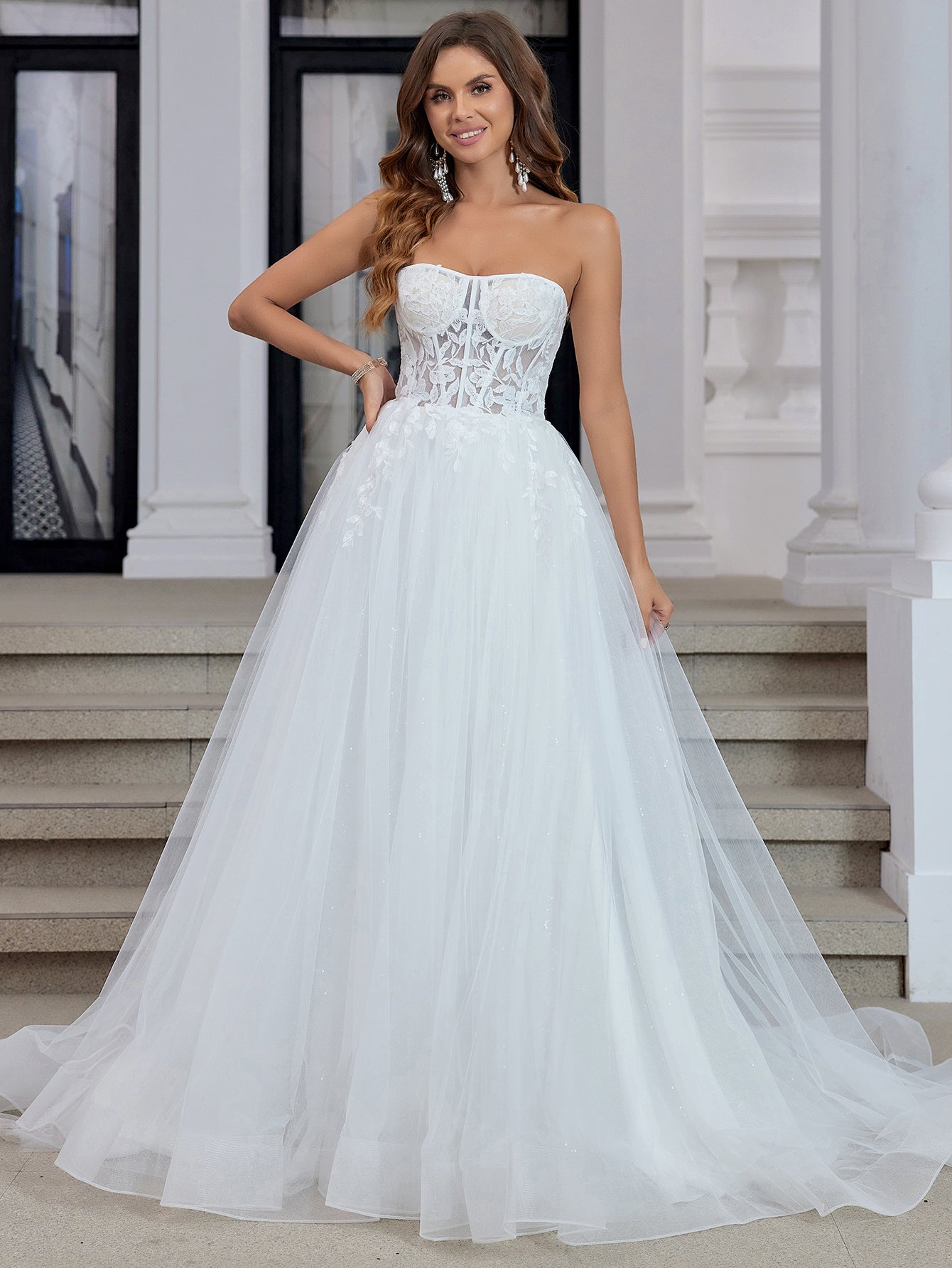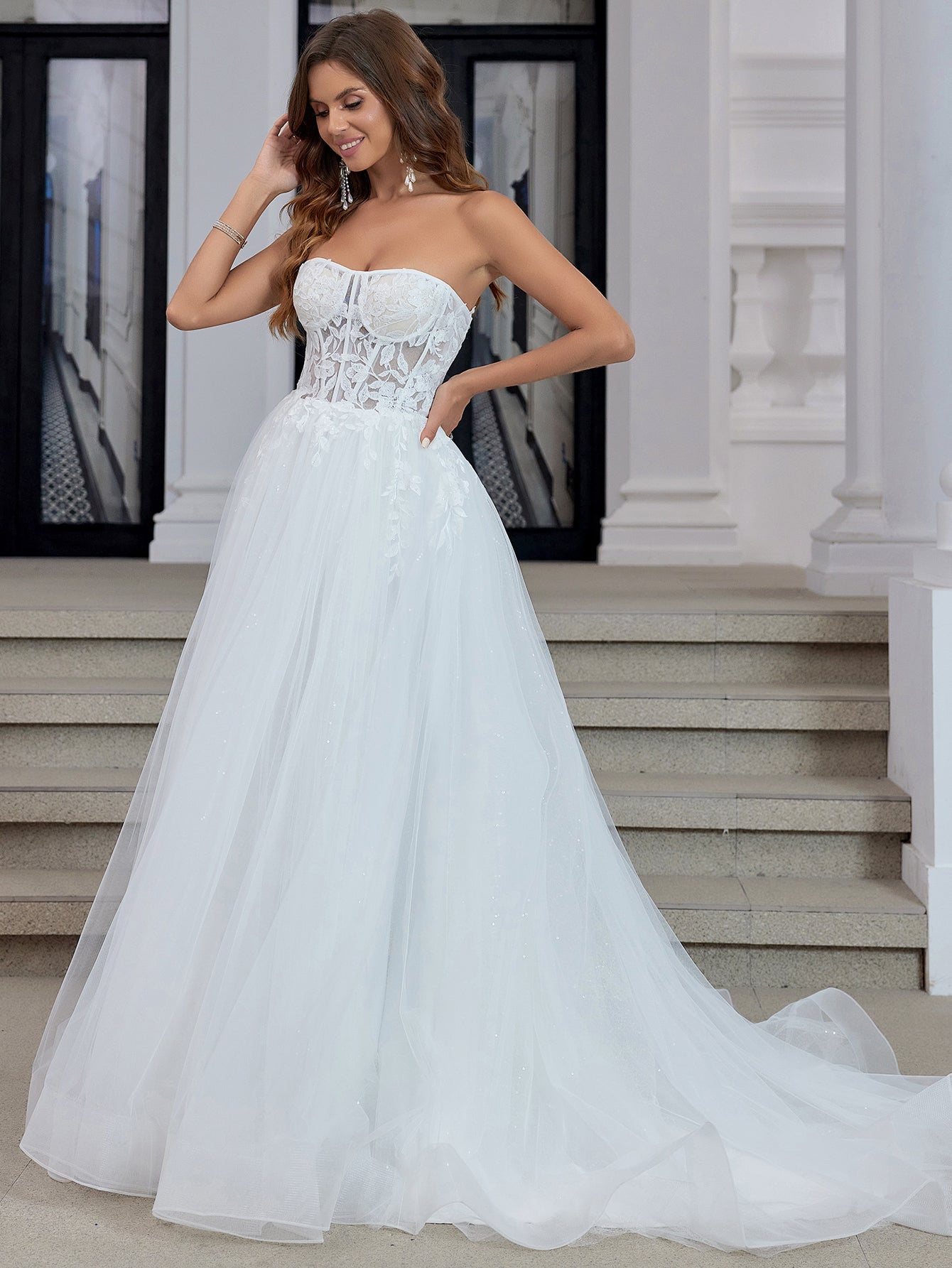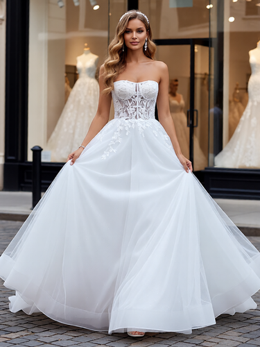 This lace bridal dress features embroidery on a sheer net bodice. The strapless wedding shower dress has a sweetheart neck and chapel train. The white outdoor dress for bridal guest is ideal for beach, outdoor wedding or garden wedding guest party.