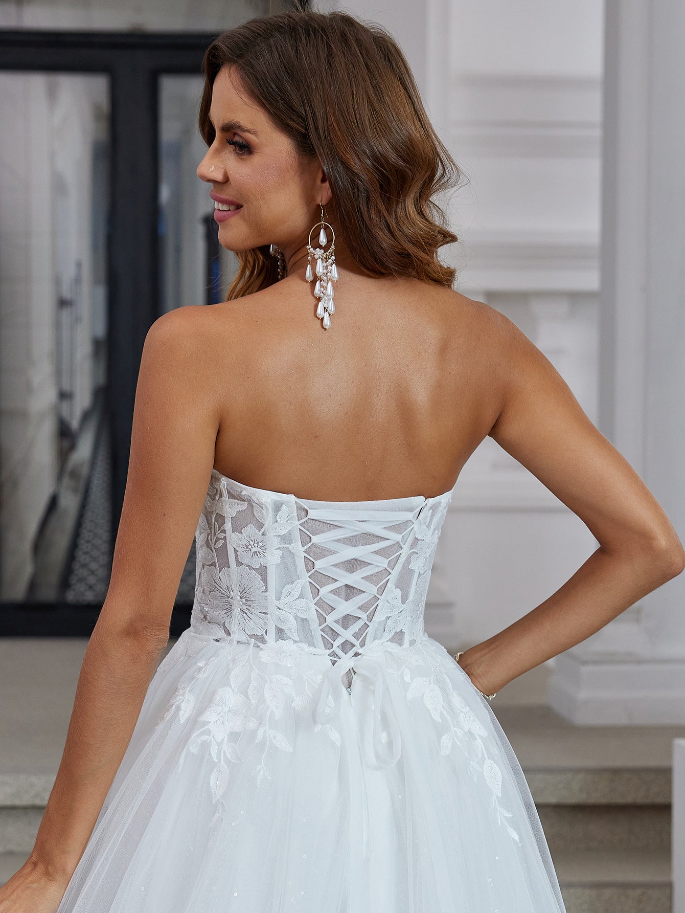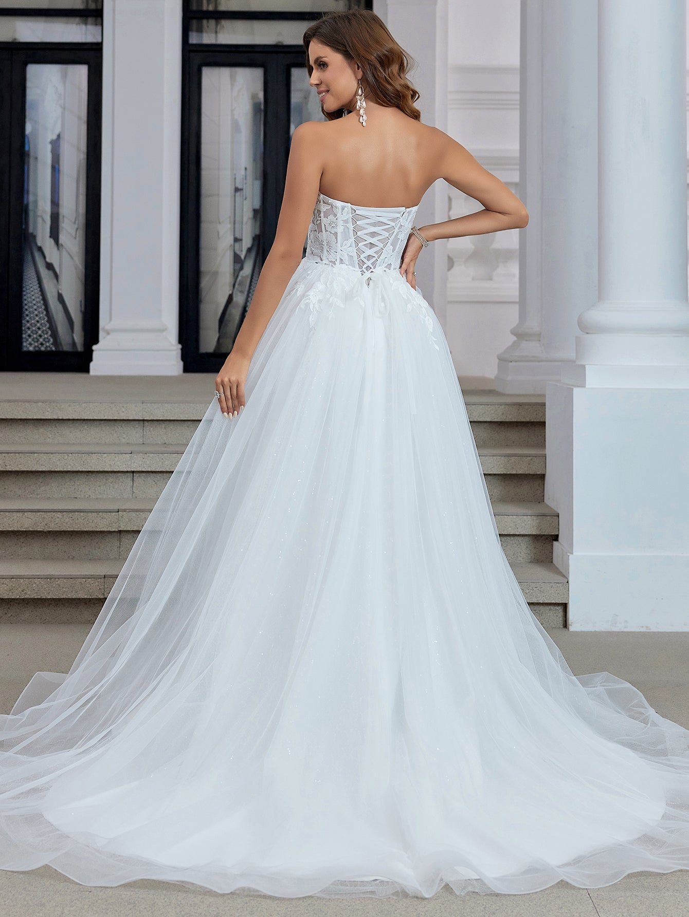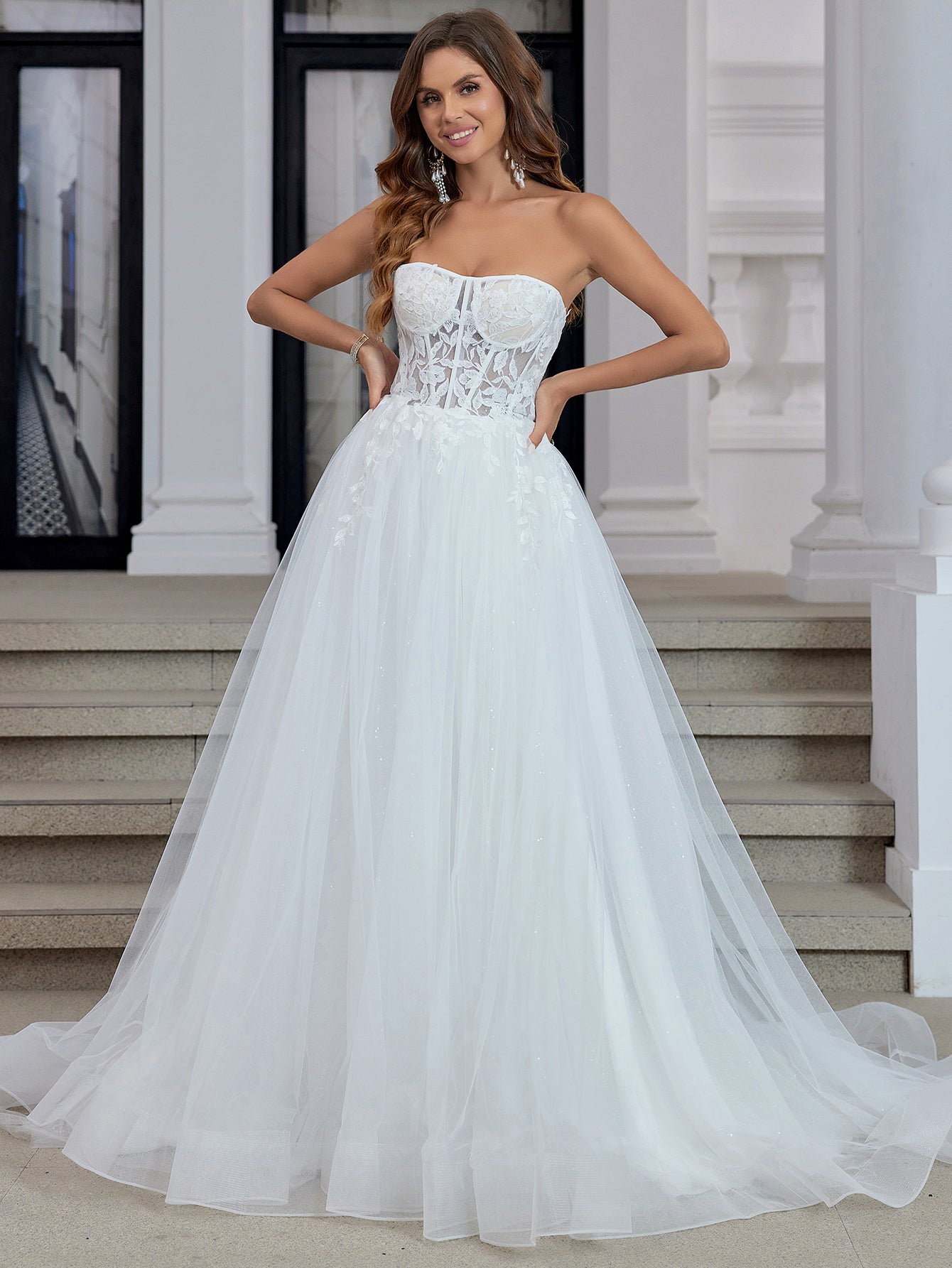 This lace bridal dress features embroidery on a sheer net bodice. The strapless wedding shower dress has a sweetheart neck and chapel train. The white outdoor dress for bridal guest is ideal for beach, outdoor wedding or garden wedding guest party.