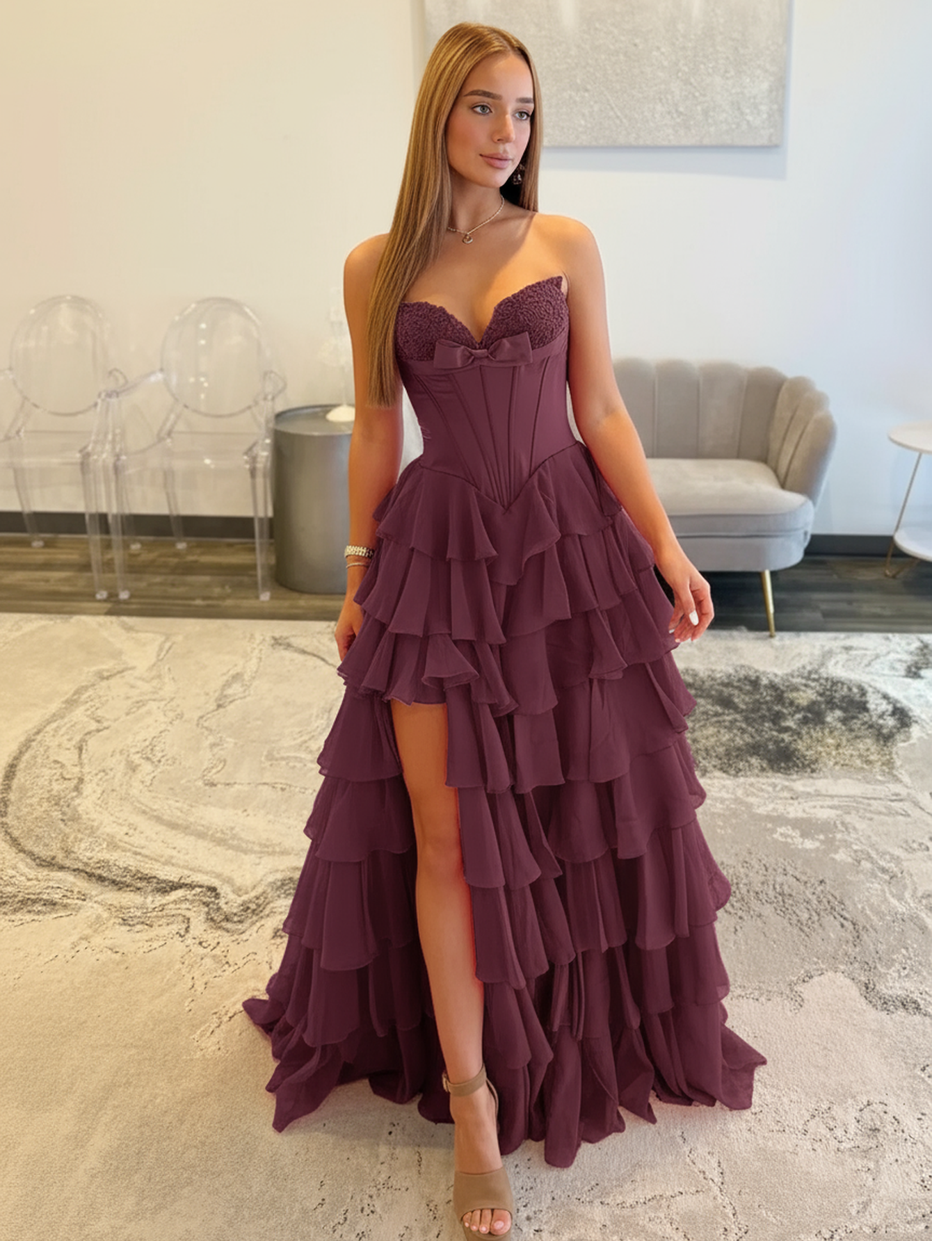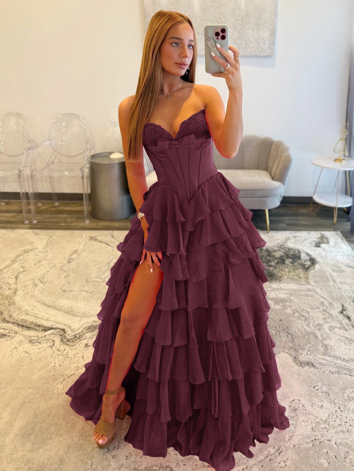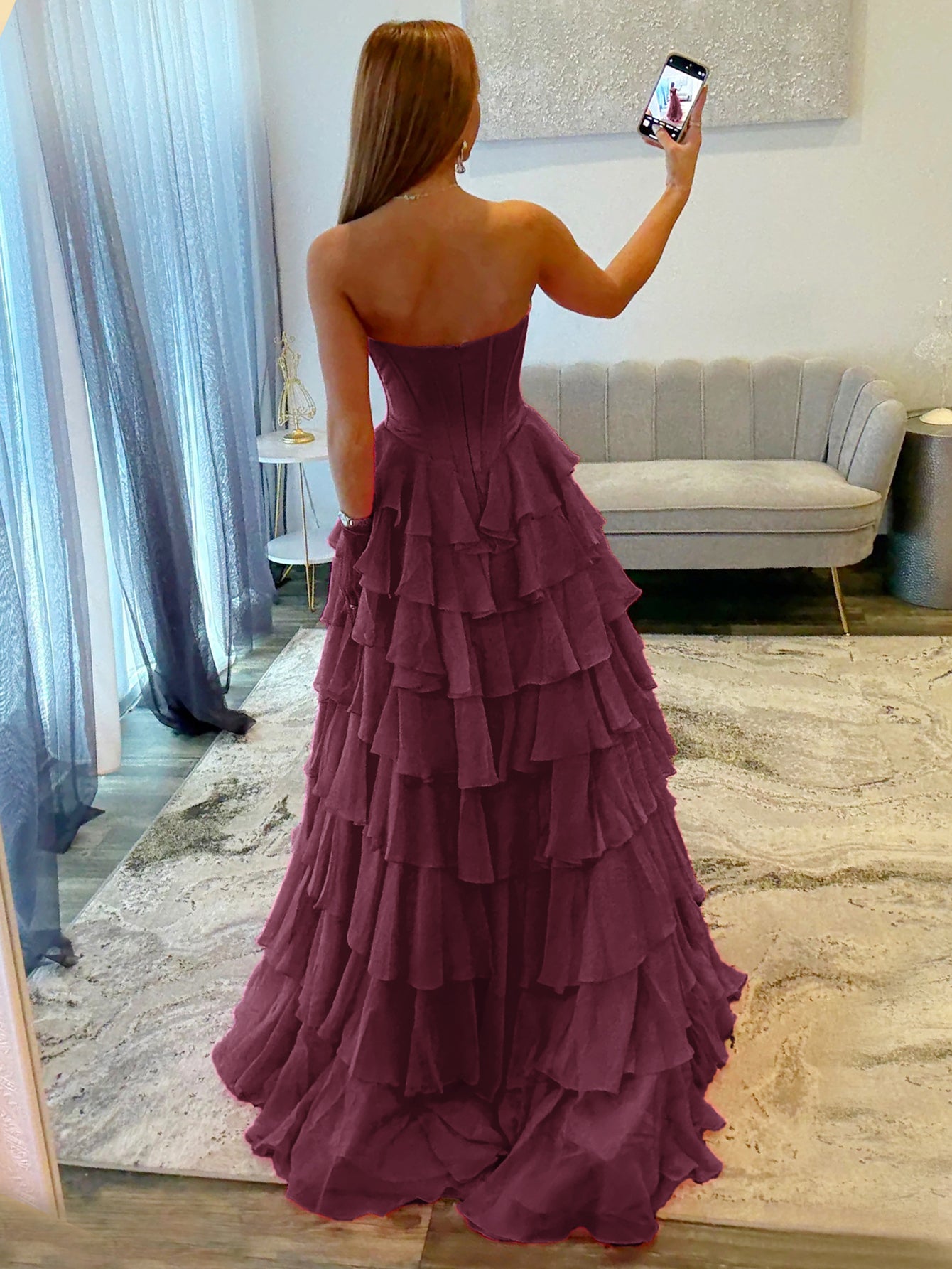 This chiffon prom gown features lace embroidery on the bodice. The strapless maxi dress has a sweetheart neckline and layered hem. This ball gown formal dress is ideal for party, evening or festivals.