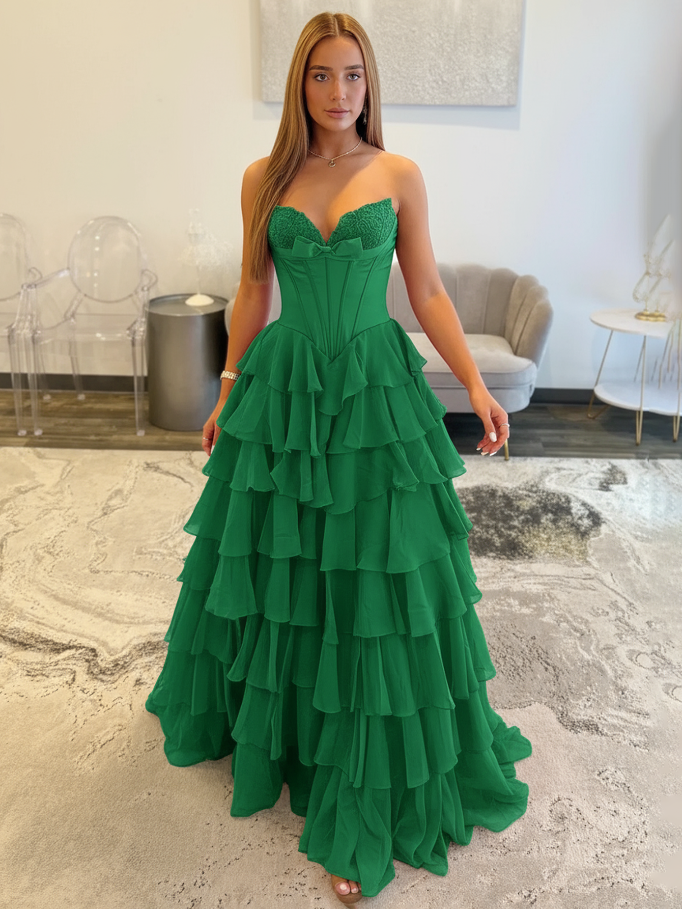 This chiffon prom gown features lace embroidery on the bodice. The strapless maxi dress has a sweetheart neckline and layered hem. This ball gown formal dress is ideal for party, evening or festivals.