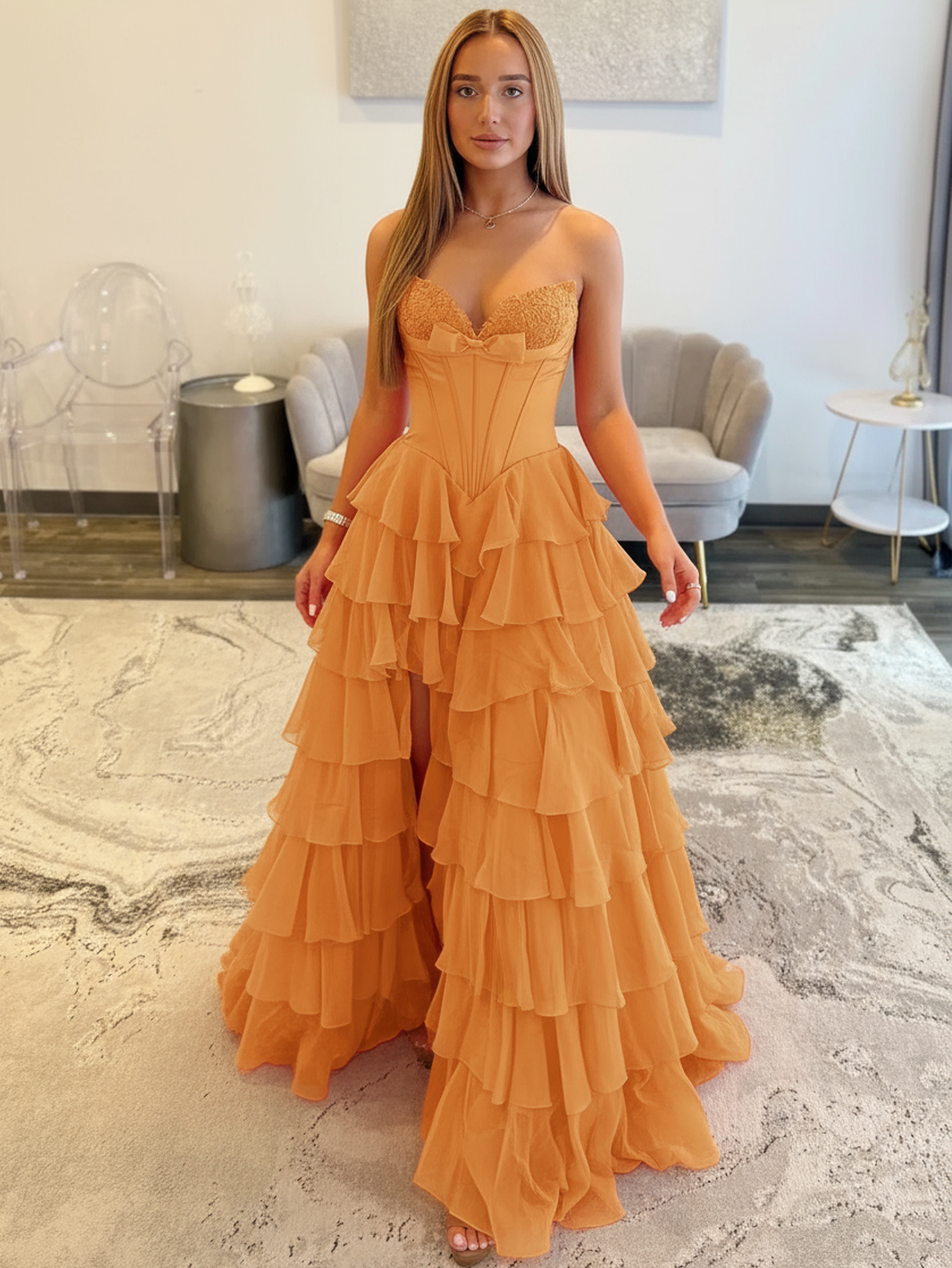 This chiffon prom gown features lace embroidery on the bodice. The strapless maxi dress has a sweetheart neckline and layered hem. This ball gown formal dress is ideal for party, evening or festivals.
