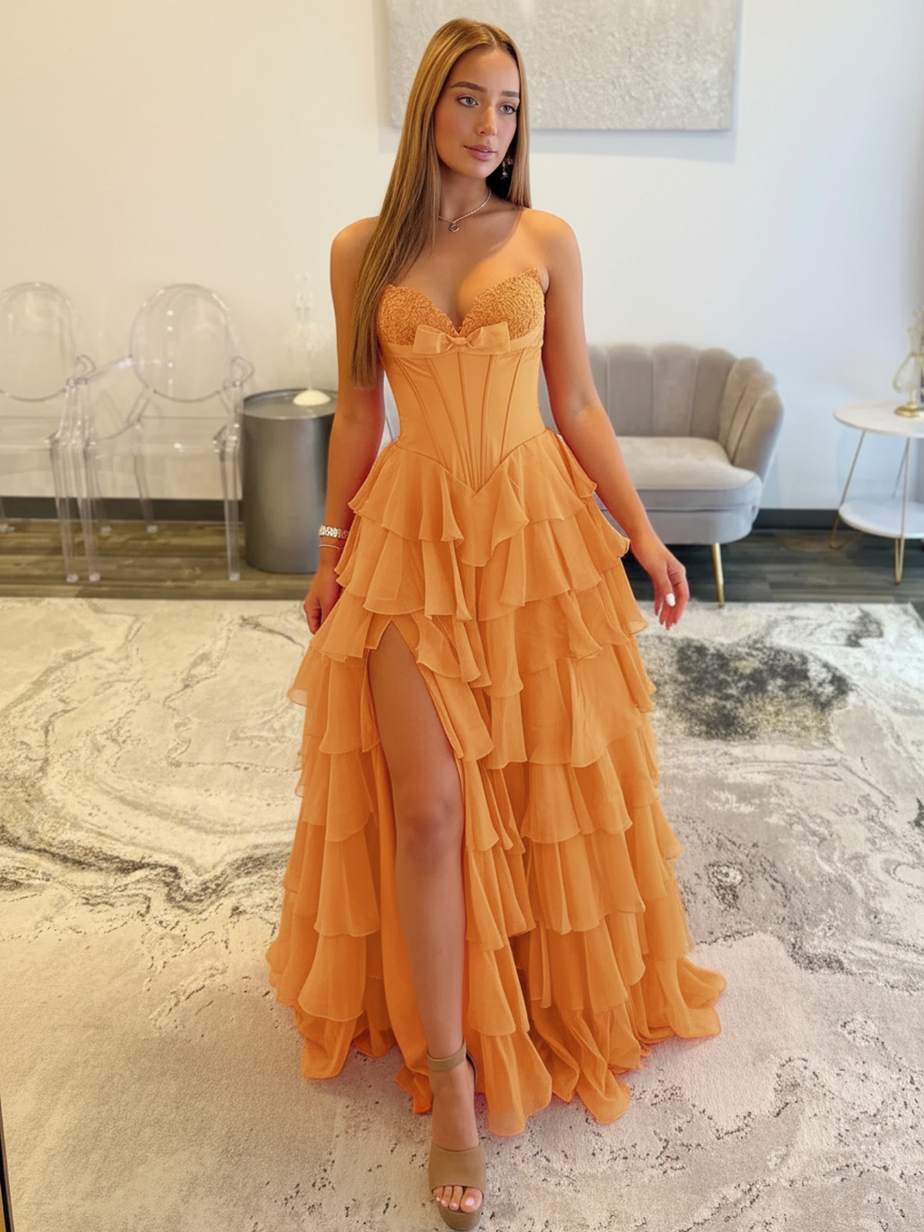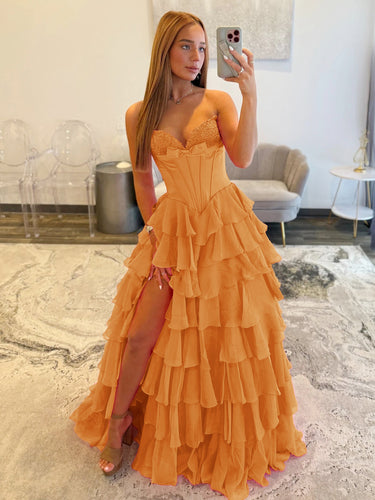 Lace Embroidery Boned Layered Ball Gown Prom Dress - Orange