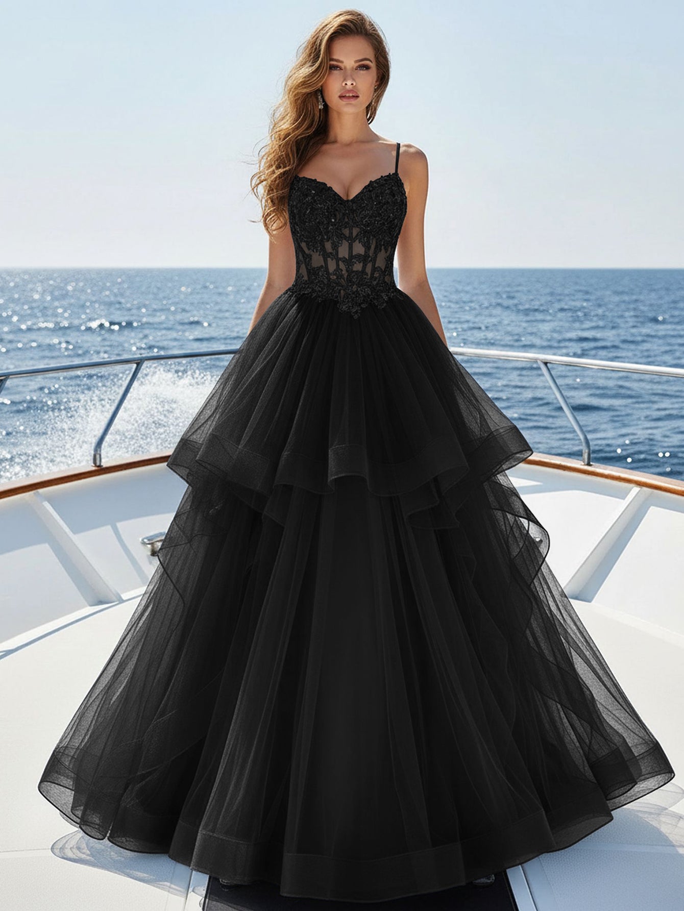 Lace Embroidery Illusion Ball Gown Prom Dress - Black