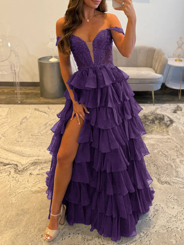 This chiffon prom gown features lace embroidery on the bodice. The off-the-shoulder ball gown has a deep V-neck and ruffled hem. This layered prom dress is ideal for party, evening or festivals.