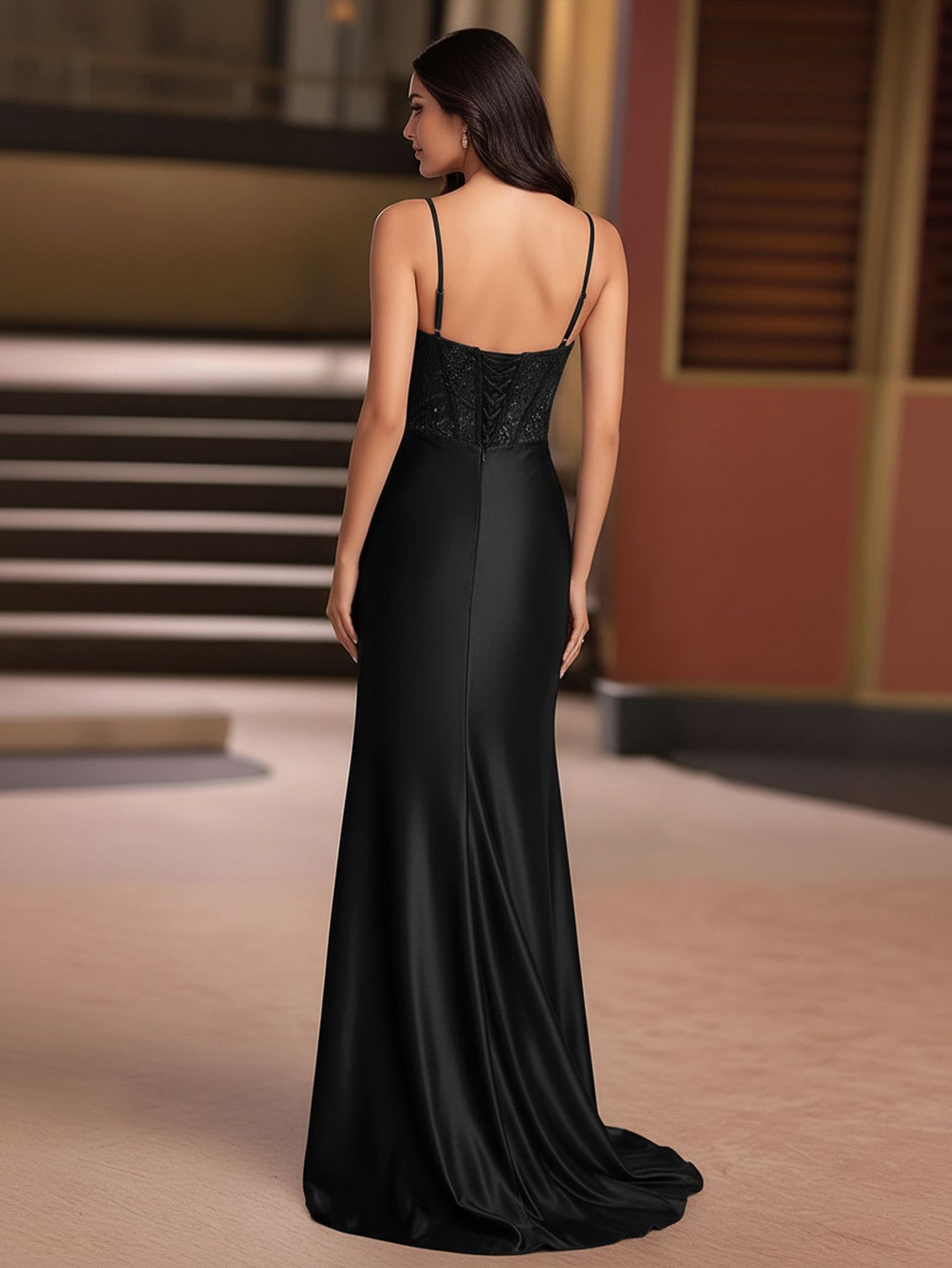 This long prom gown features lace embroidery on the illusion bodice. The strapless maxi dress has a V-neckline and twist hem. Mermaid split formal dresses are ideal for party, evening or festivals.