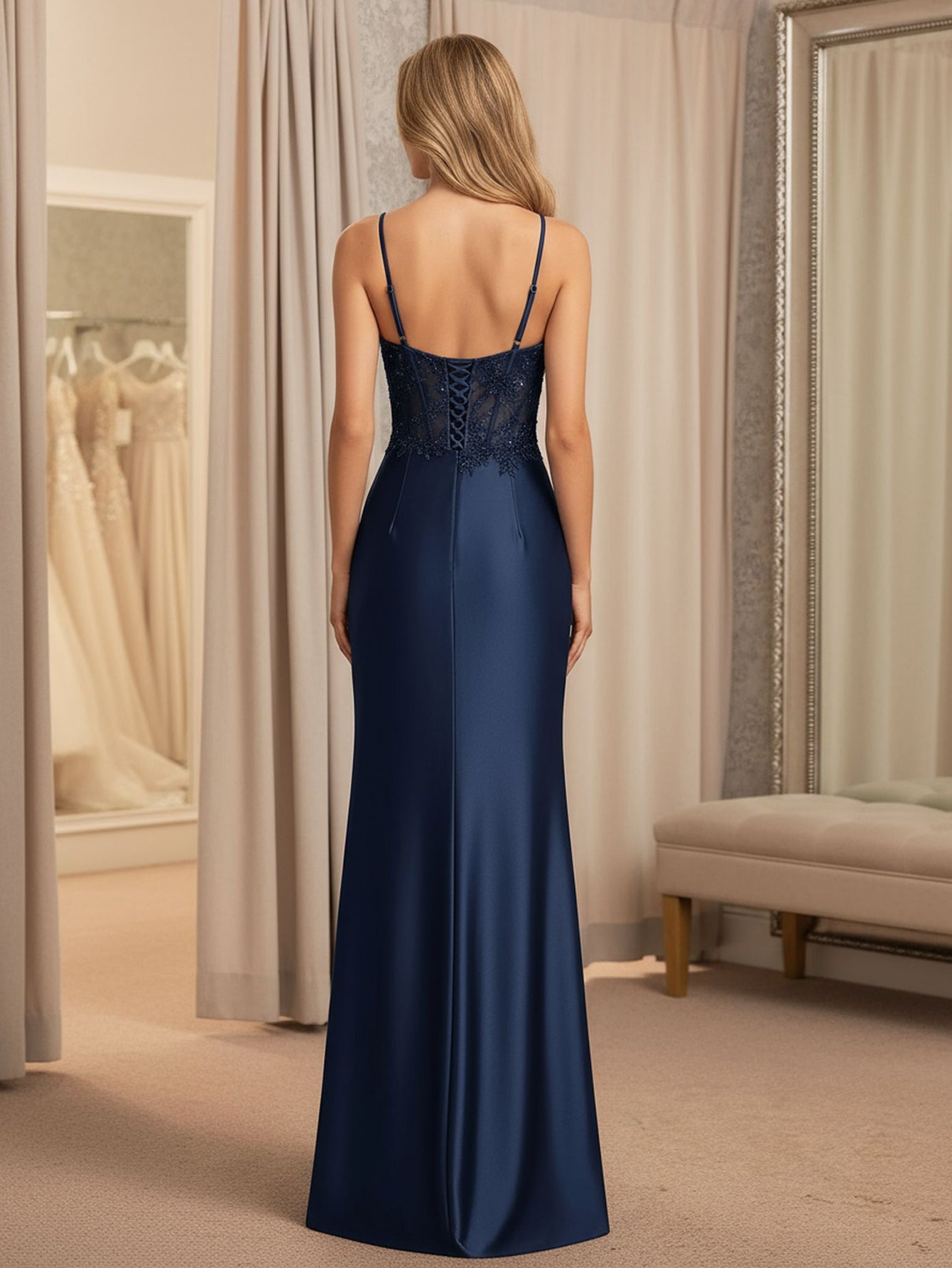 Details: Backless, Lace Embroidery, Split, Ruched, Bodice, Illusion, Twist, Corset