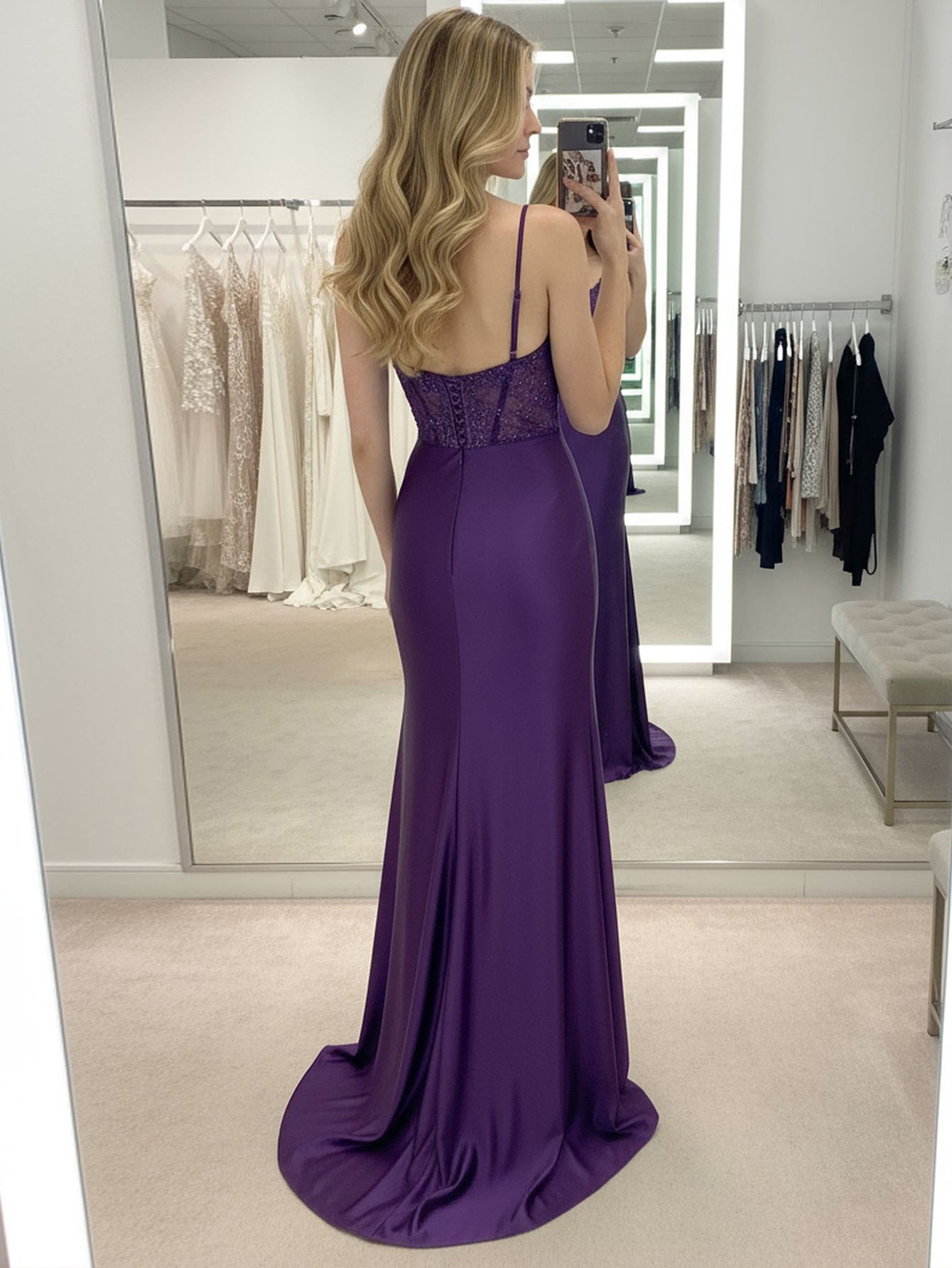 Details: Backless, Lace Embroidery, Split, Ruched, Bodice, Illusion, Twist, Corset