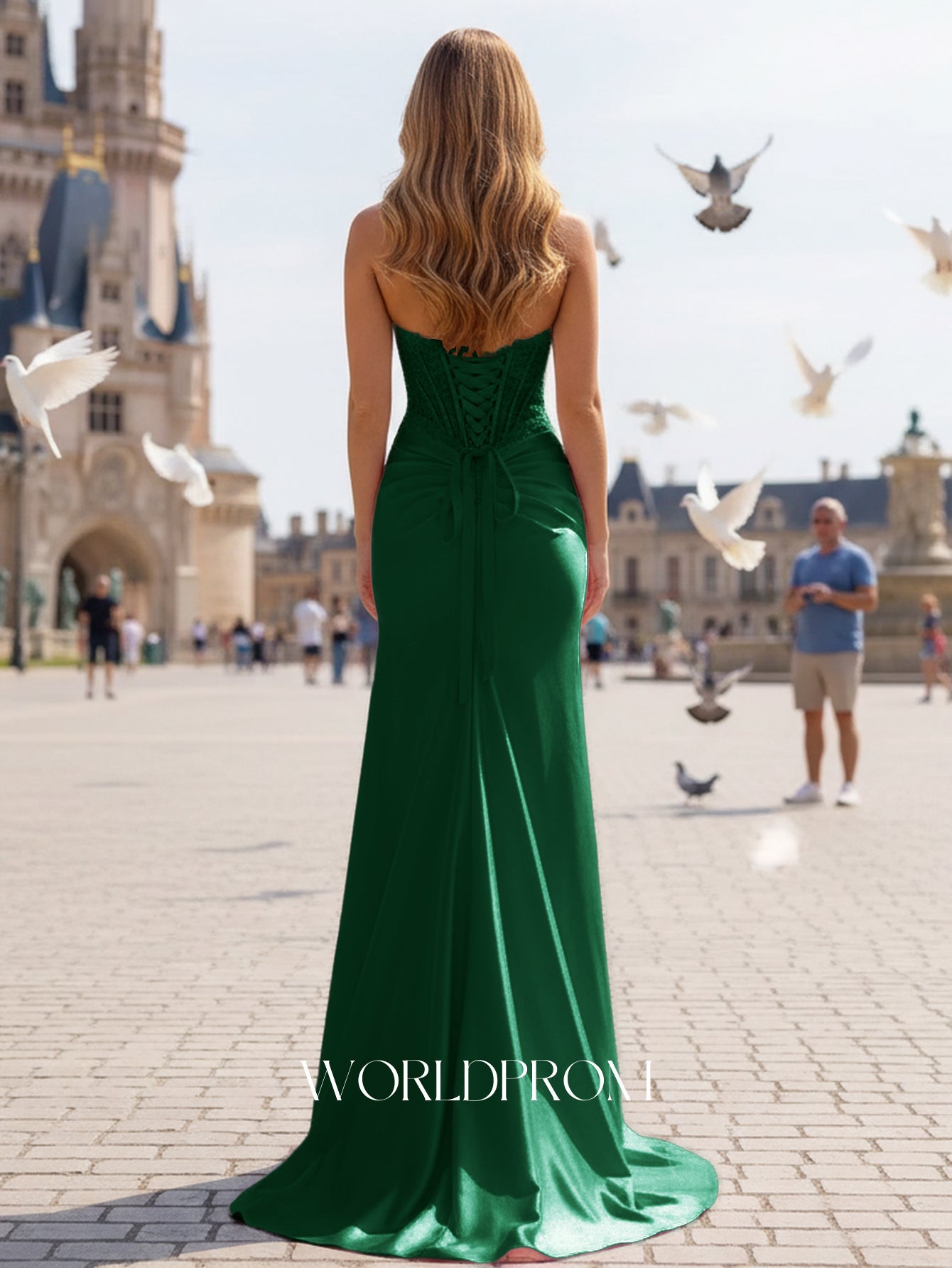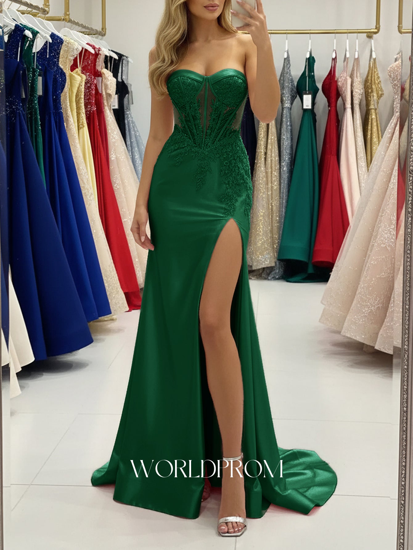 This satin prom gown features embroidery sheer on the illusion bodice. The strapless dress has a sweetheart neckline and split hem. Worldprom trumpet prom dresses are ideal for party, evening or festivals.