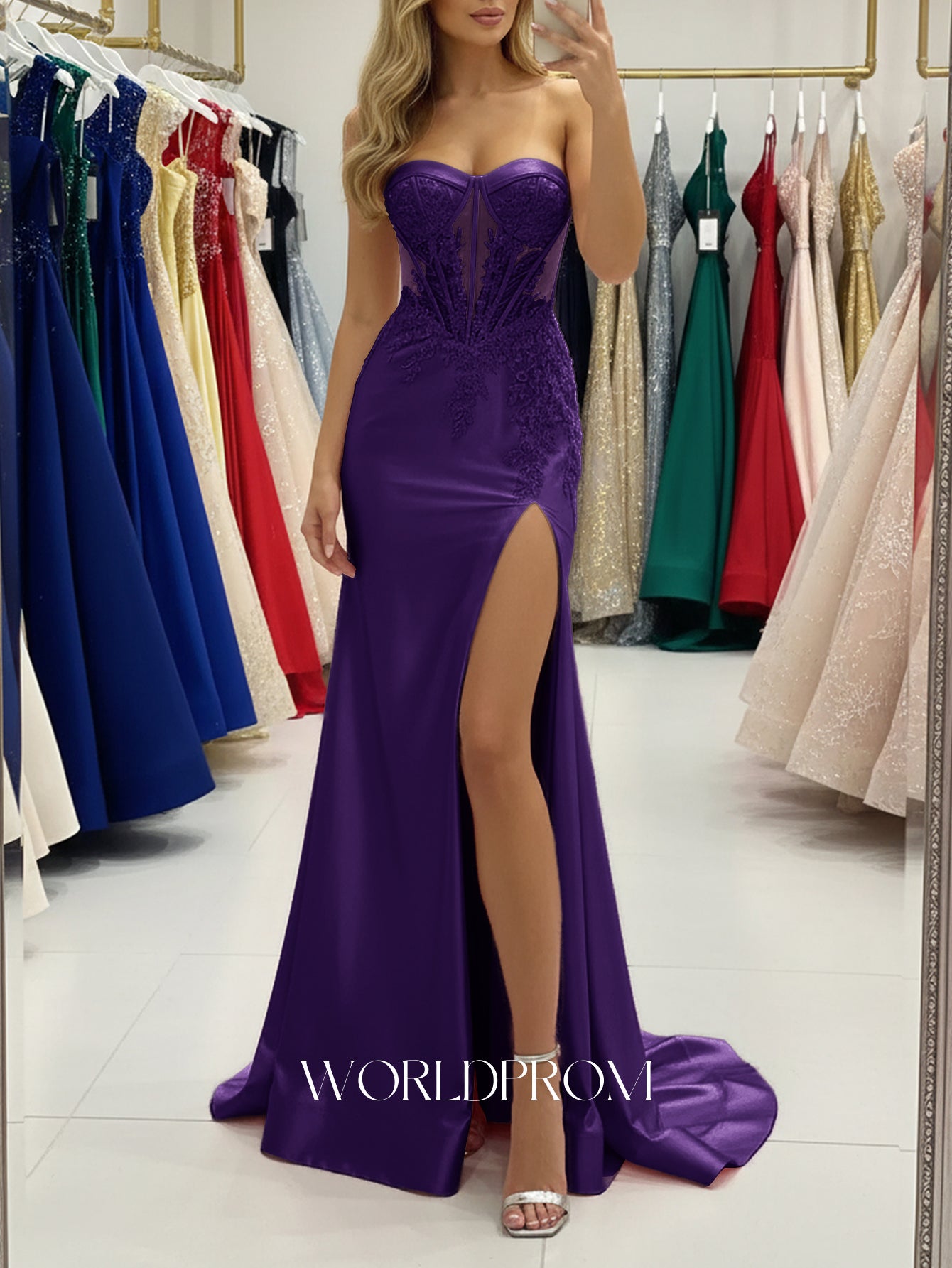 This satin prom gown features embroidery sheer on the illusion bodice. The strapless dress has a sweetheart neckline and split hem. Worldprom trumpet prom dresses are ideal for party, evening or festivals.
