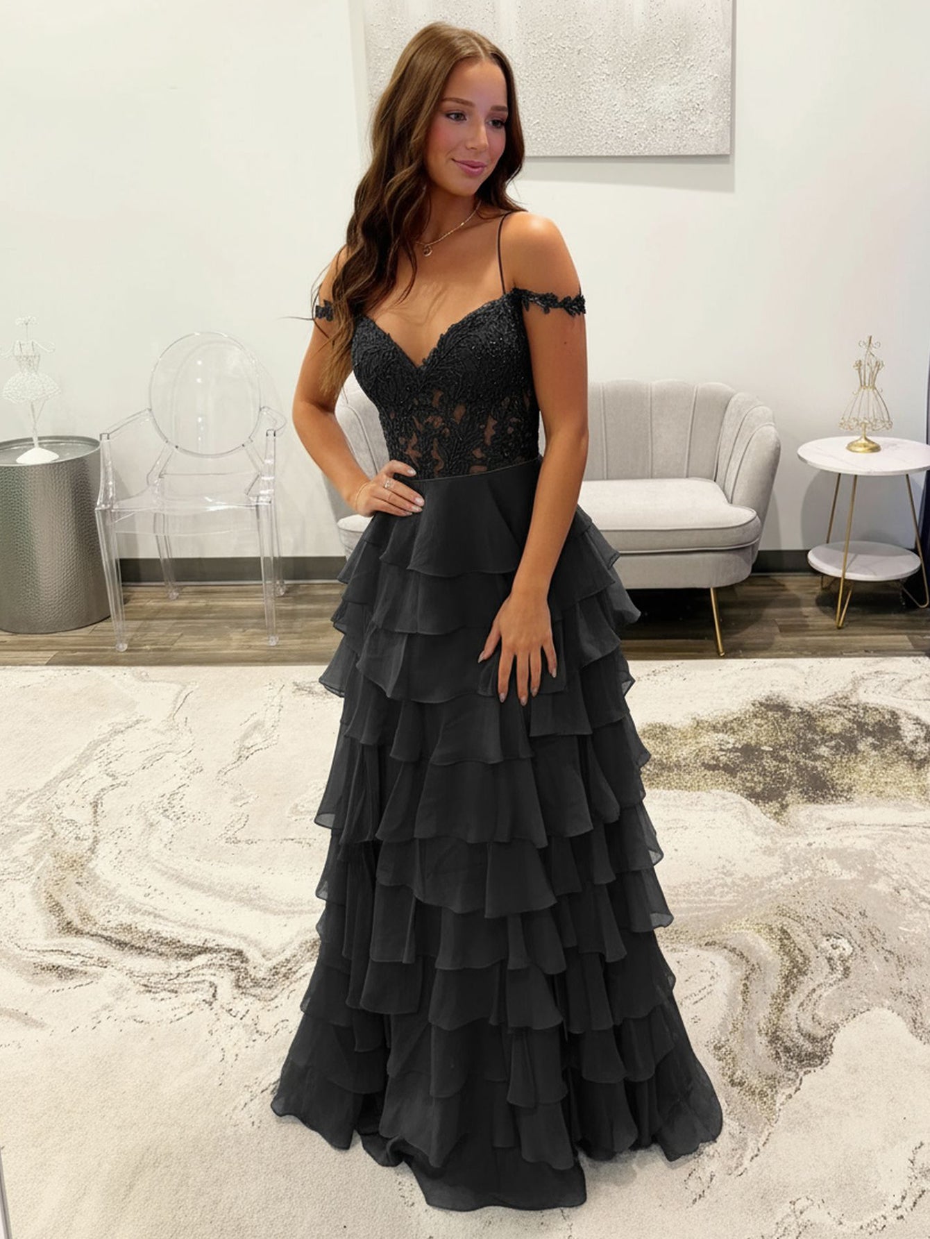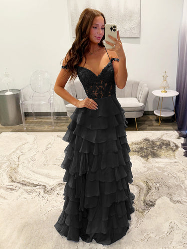 Lace Illusion Ruffle Tiered Ball Gown Prom Dress - Black