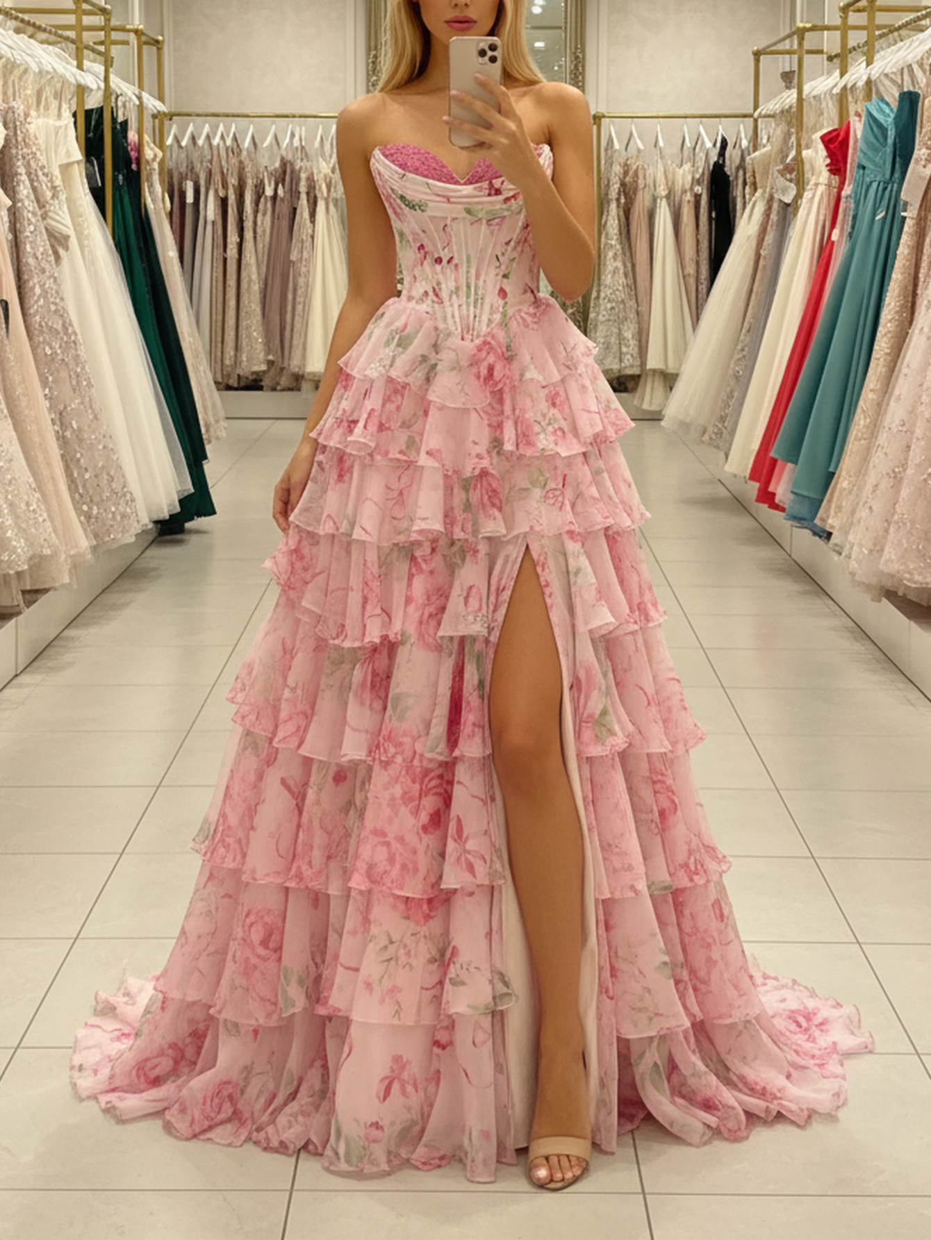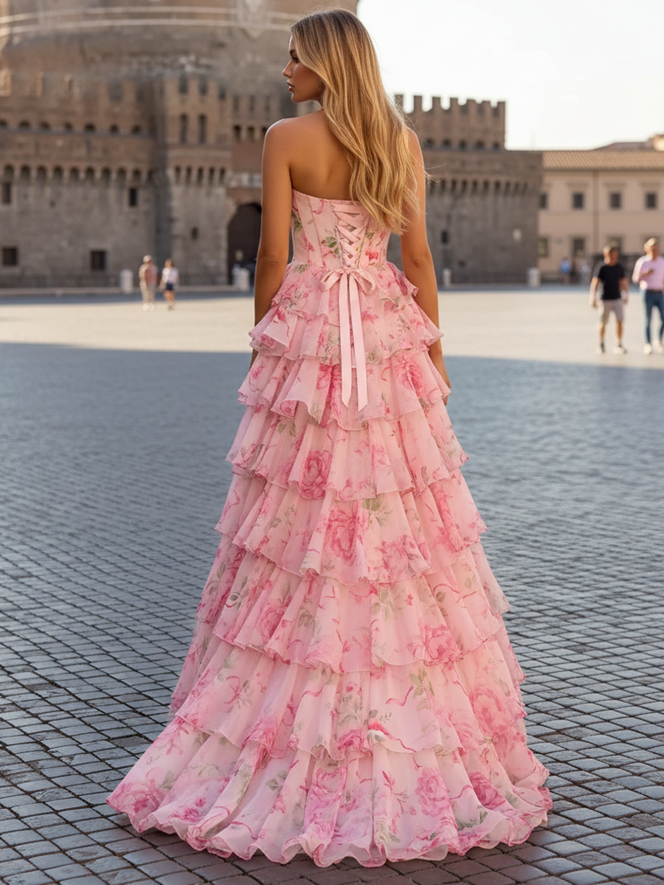 Lace Ruched Bust Corset Floral Layered Ruffle Hem Long Prom Dress - Pink Floral