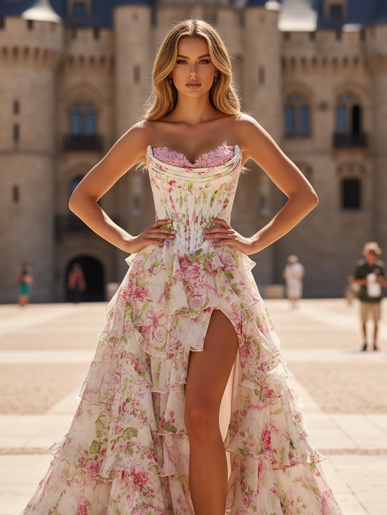 Details: Floral, Ruched Bust, Corset, Ruffled, Split, Lace Up