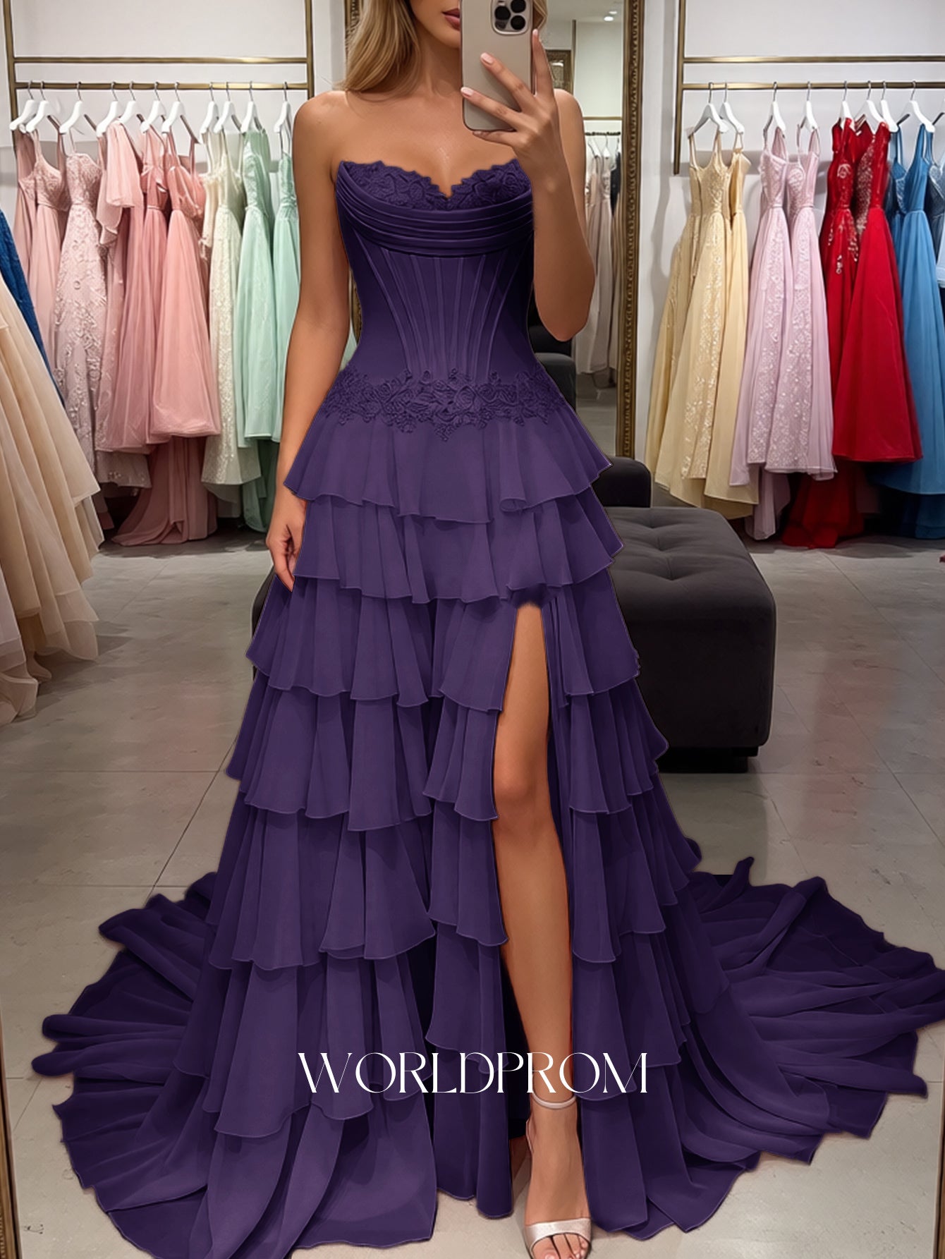 Lace Ruched Bust Layered Ruffle Hem Long Ball Gown Prom Dress With Slit - Purple