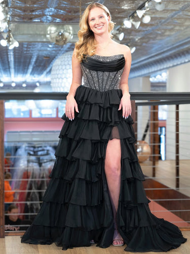 Layered Luxury Crystal Boned Bodice Ball Gown Prom Dress - Black