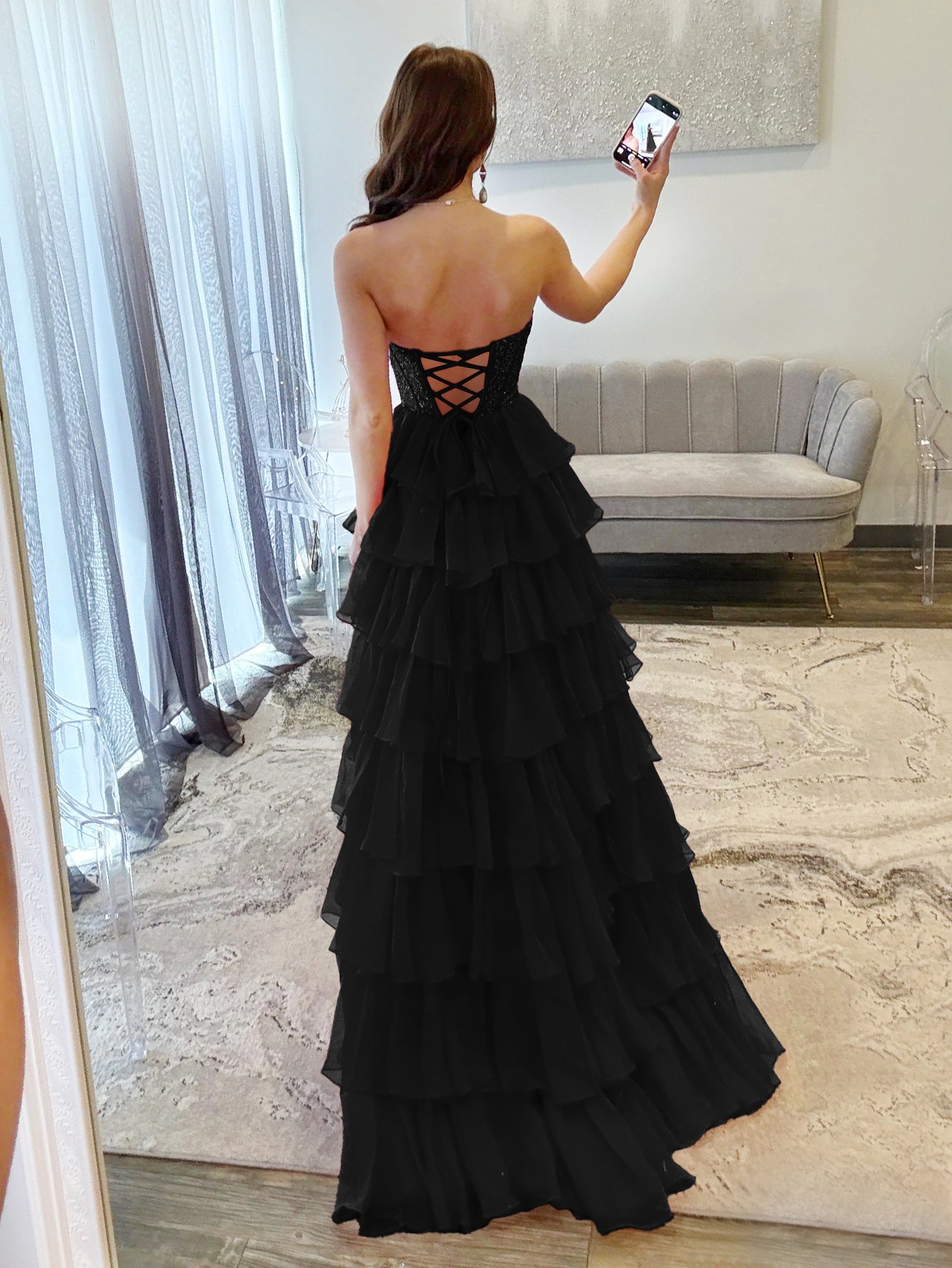 This luxury gown features intricate boned with crystal on a sheer net bodice. The strapless prom dress has a scoop neckline and layered hem. This ball gown evening dress is ideal for party, evening or festivals.