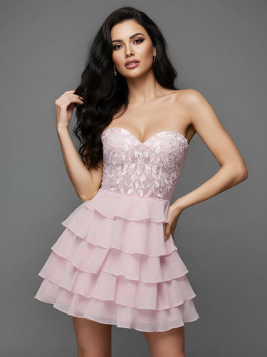 Leaf Lace Hot Fix Sheer Bodice Boned Layered Mini Prom Dress - Blush Pink