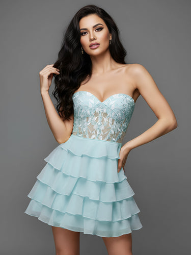 Leaf Lace Hot Fix Sheer Bodice Boned Layered Mini Prom Dress - Light Blue
