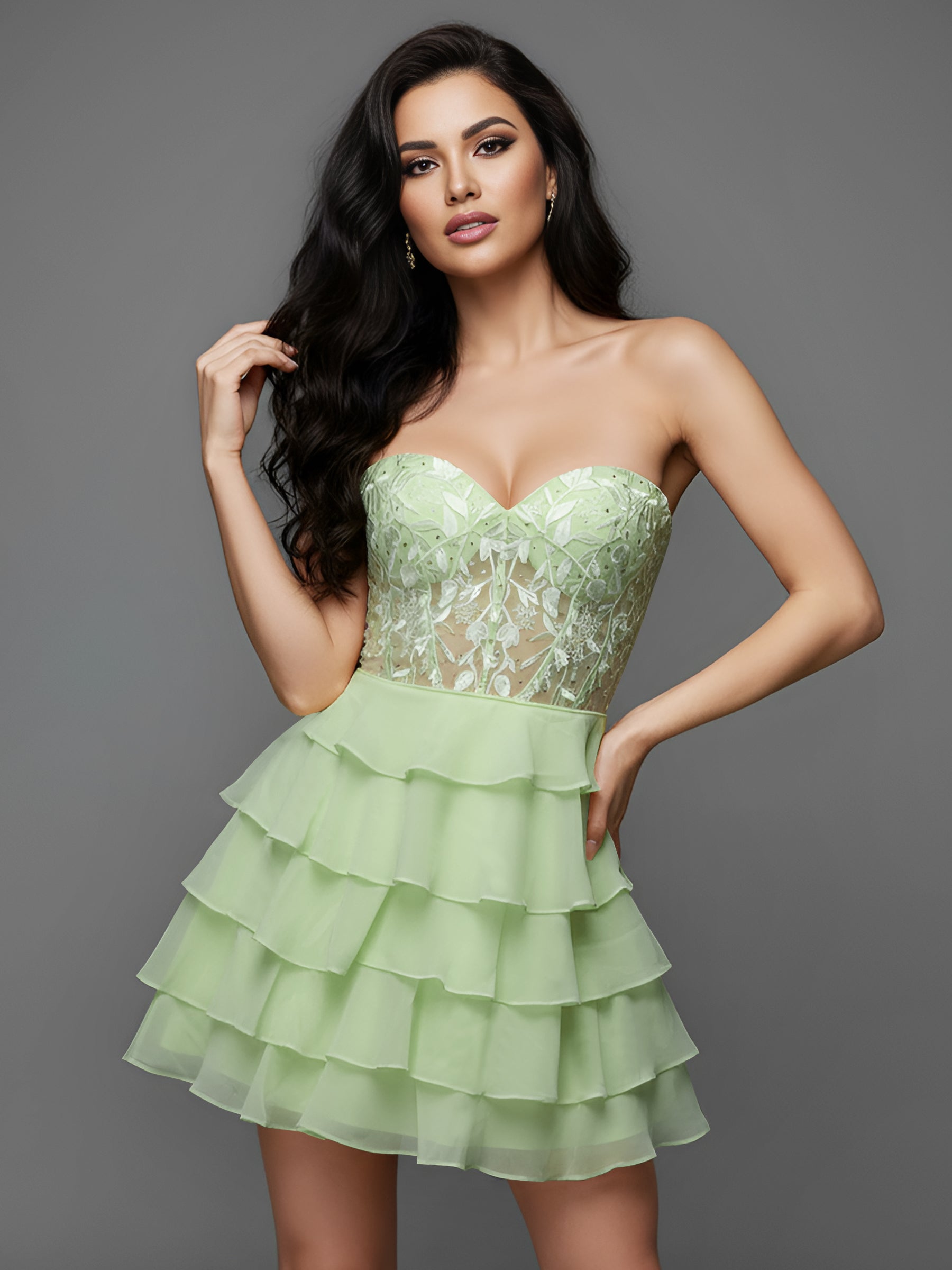 Leaf Lace Hot Fix Sheer Bodice Boned Layered Mini Prom Dress - Mint Green