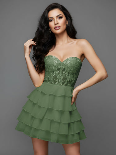 Leaf Lace Hot Fix Sheer Bodice Boned Layered Mini Prom Dress - Sage Green