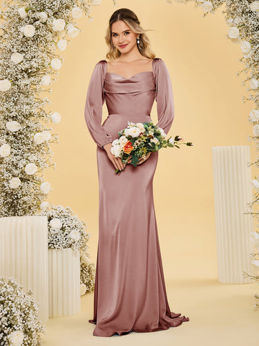 Long Sleeve Acetate Satin Sheath Bridesmaid Dress With Ruched Bust - Dusty Rose