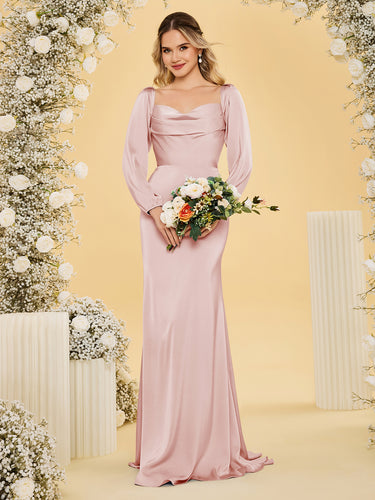 Long Sleeve Acetate Satin Sheath Bridesmaid Dress With Ruched Bust - Pink