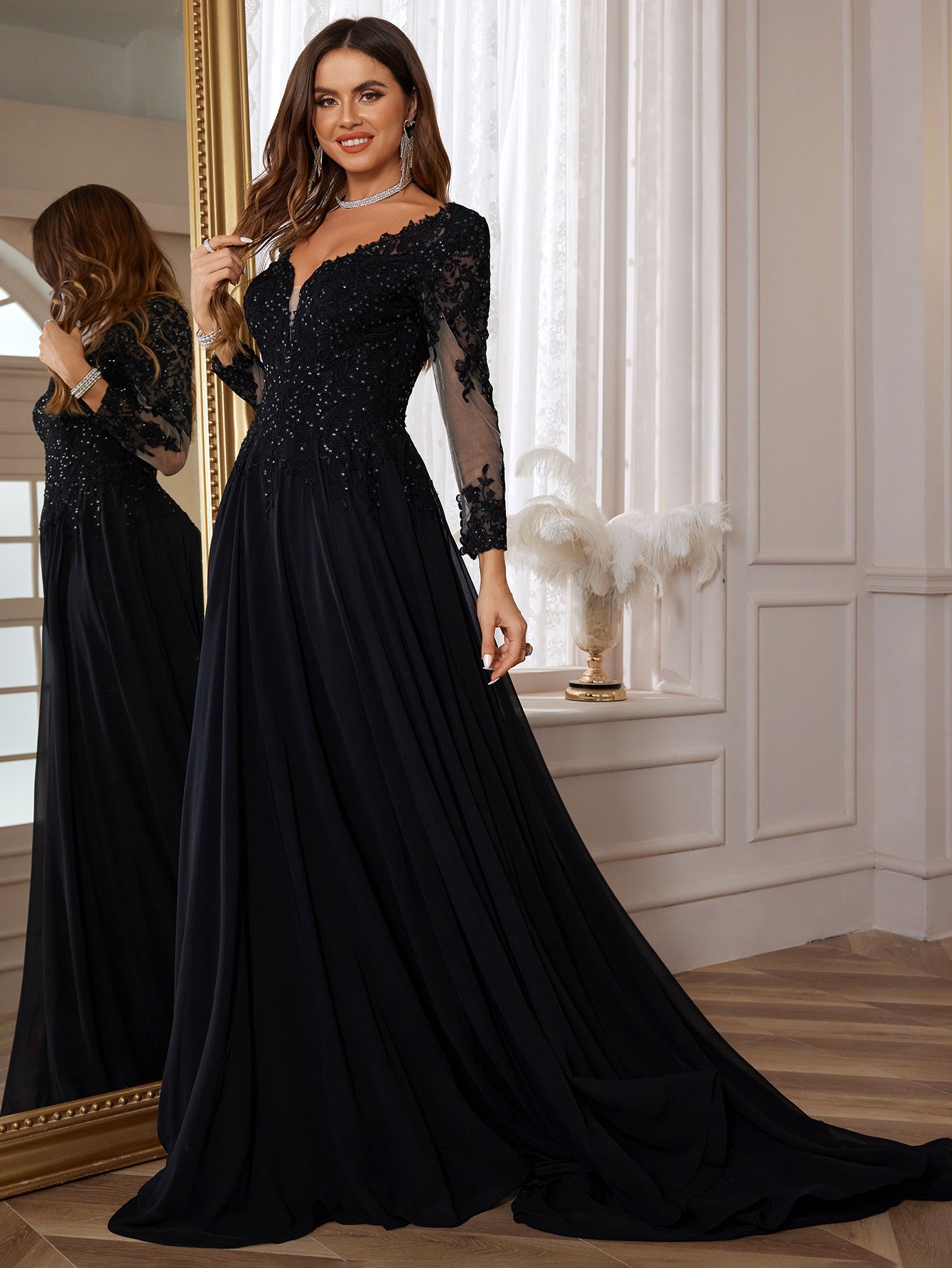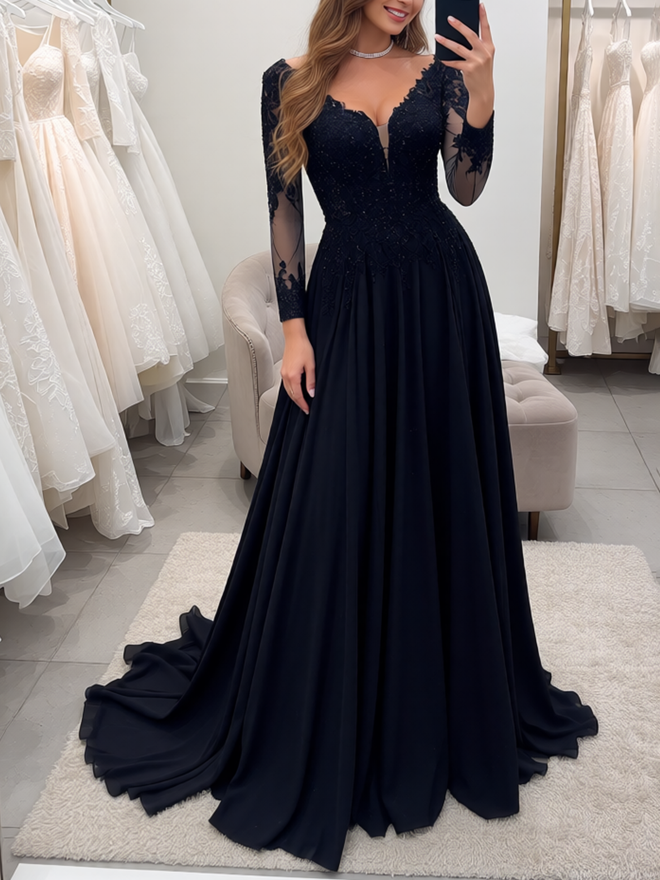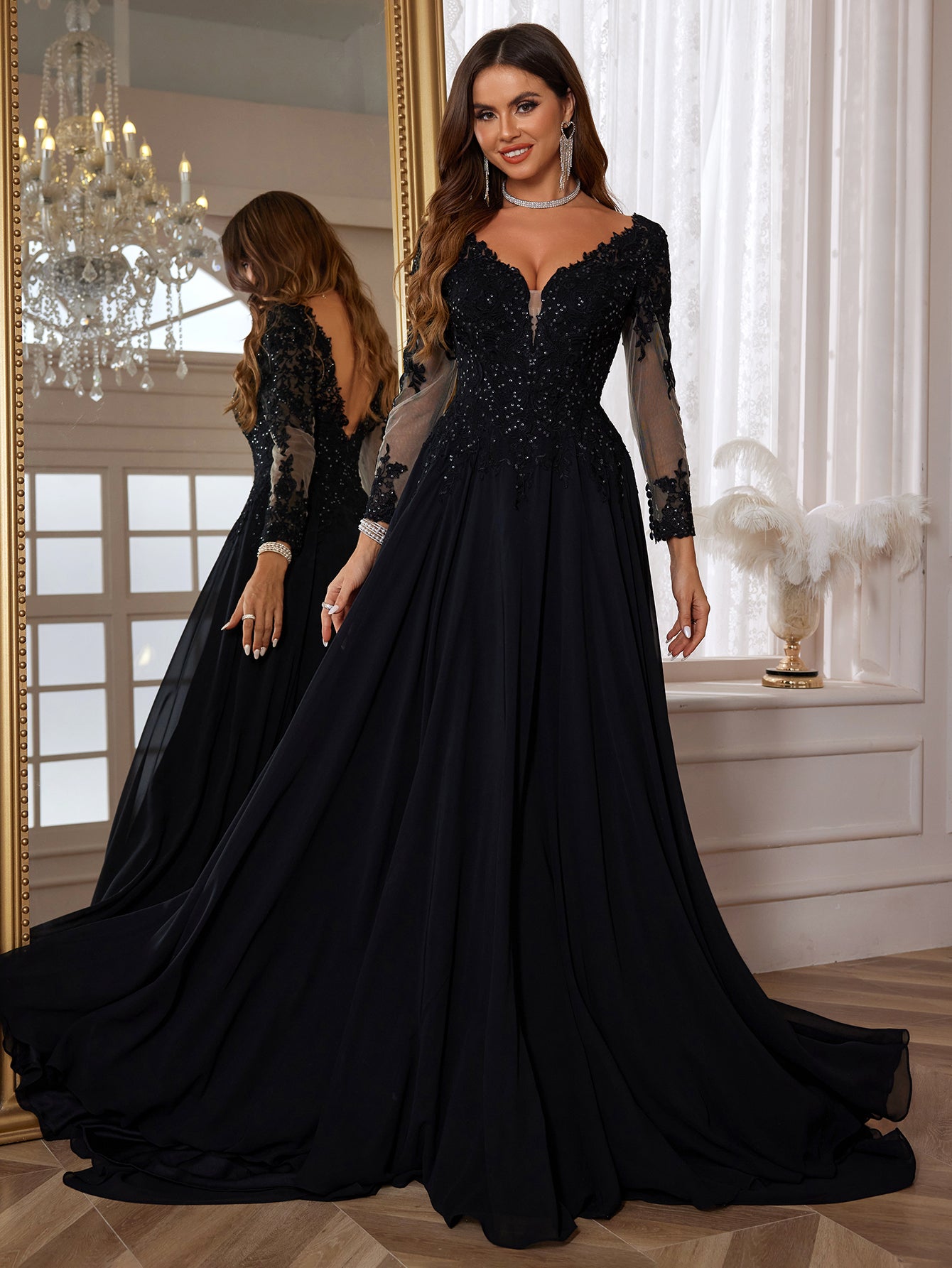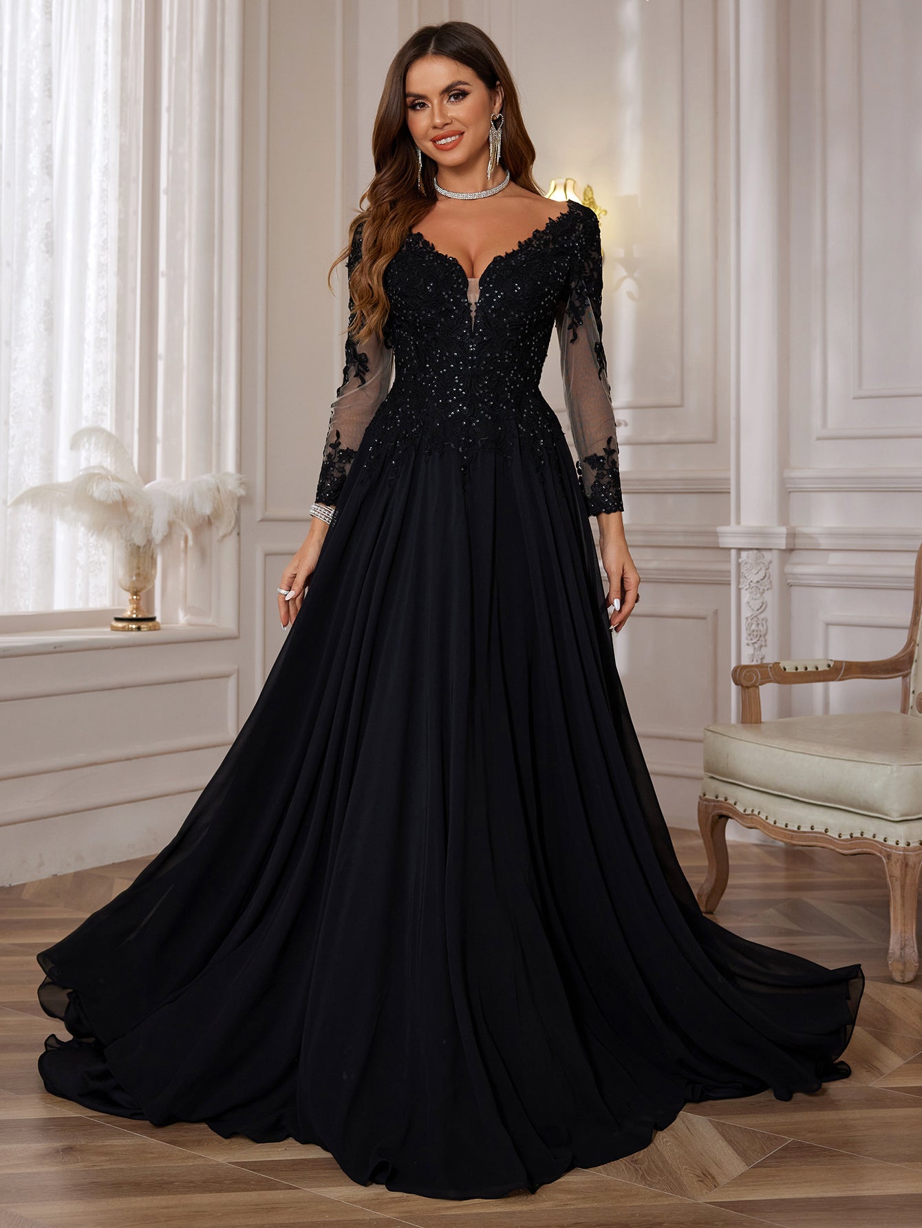 Long Sleeves Embroidery Ball Gown Lace Vintage Wedding Dress - Black