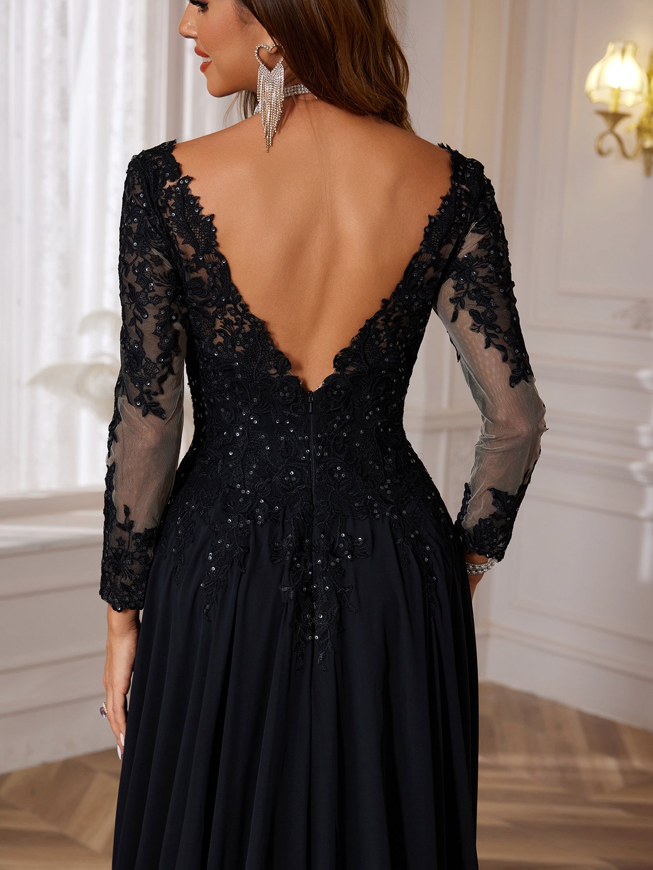 Details: Backless, Fitted Waist, Lace, Embroidery, Cut Front