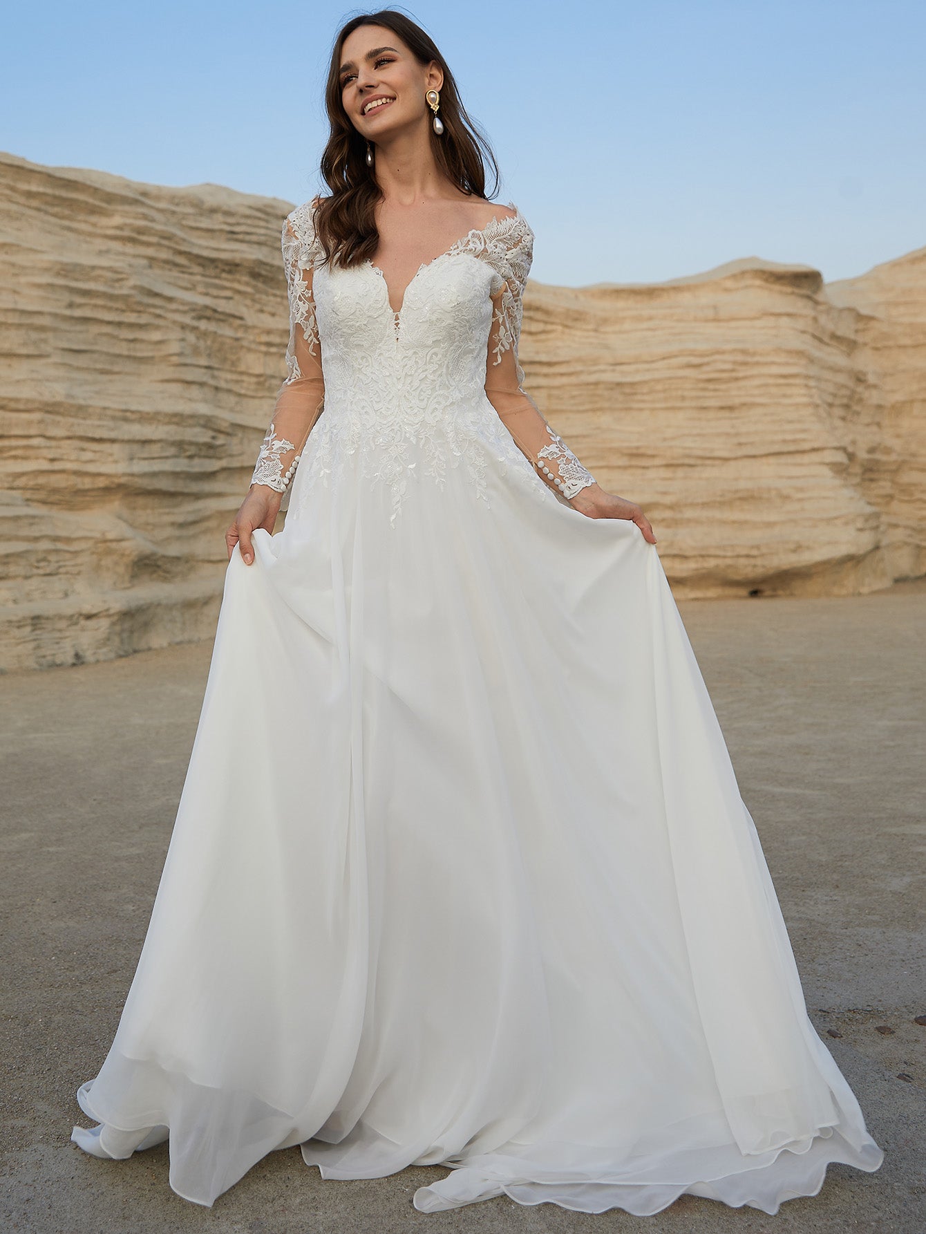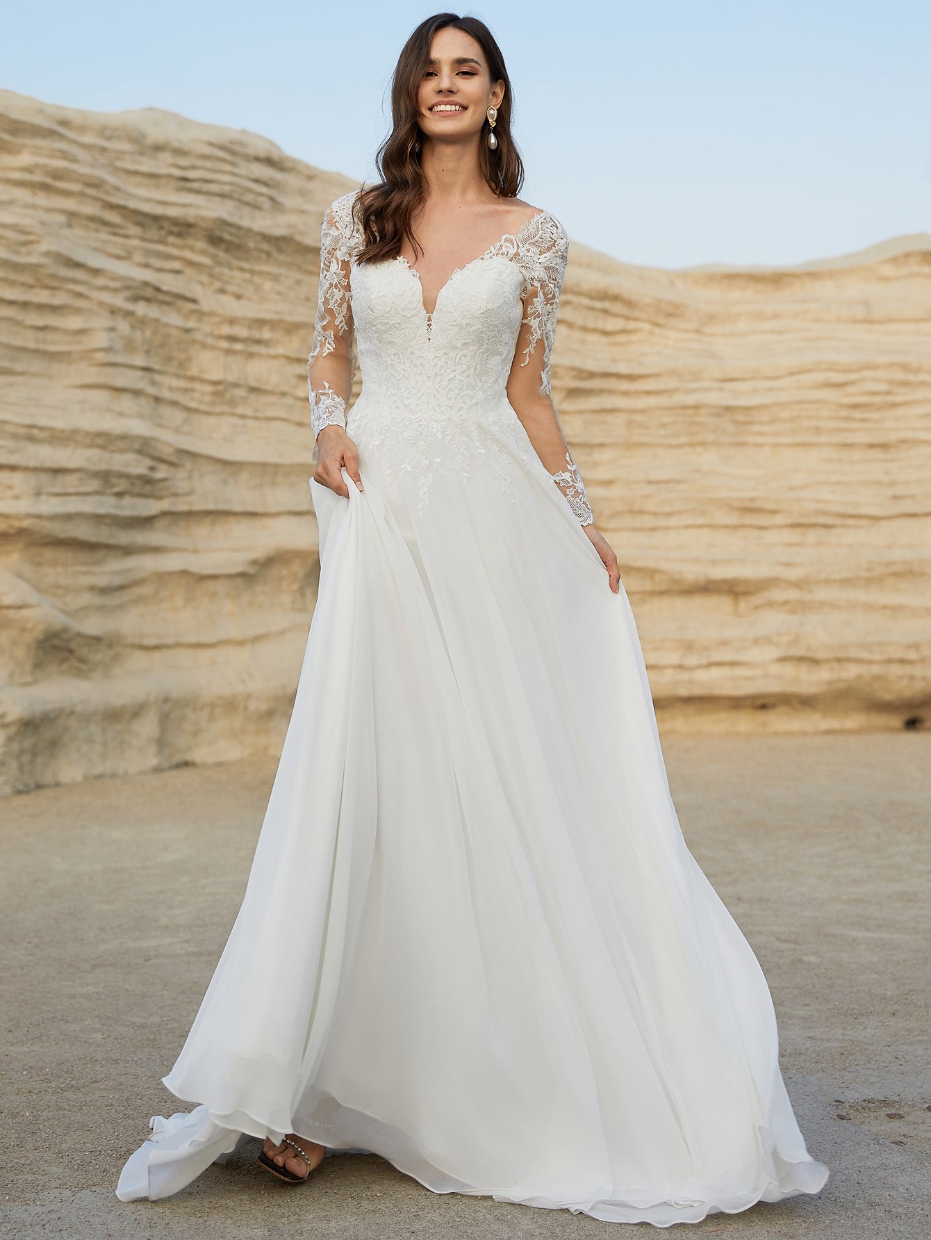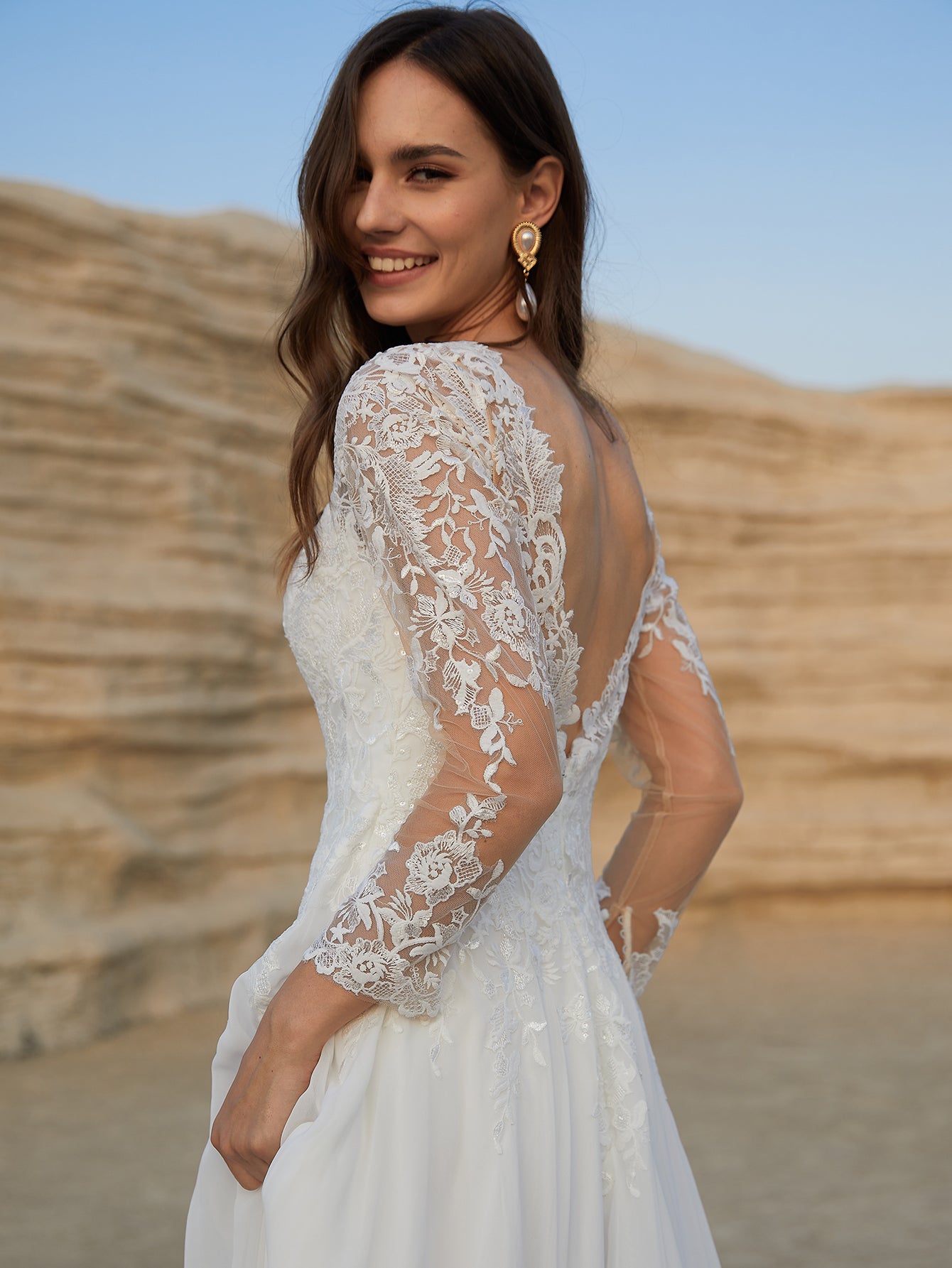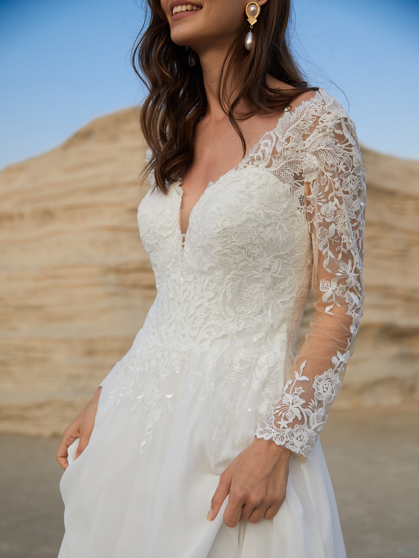 This lace bridal dress features embroidery on the bodice. The long sleeves wedding shower dress has a v-neck and ball gown hem. The white dress for bridal guest is ideal for beach, outdoor wedding or garden wedding guest party.