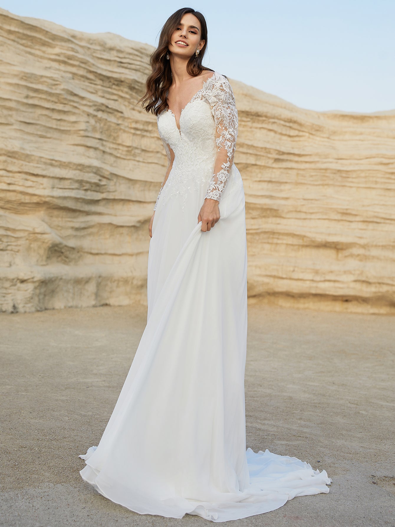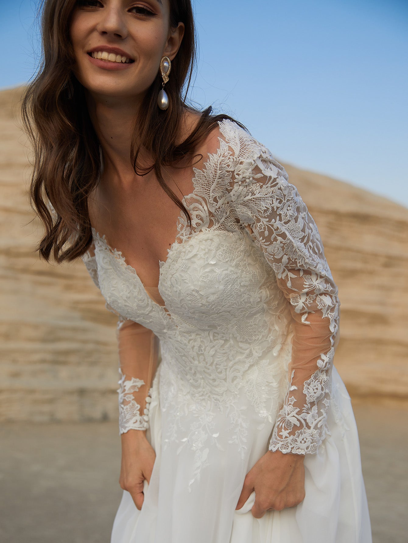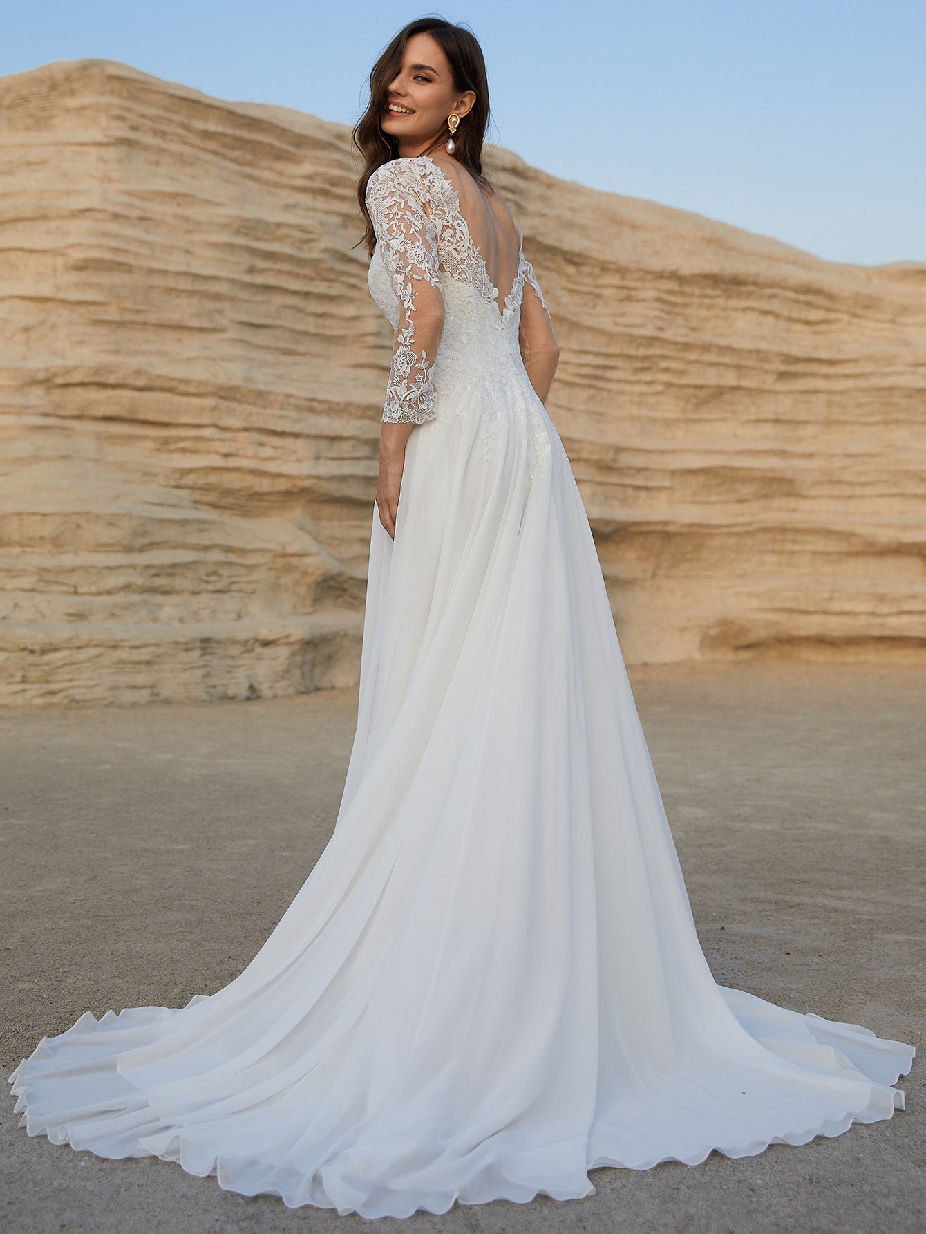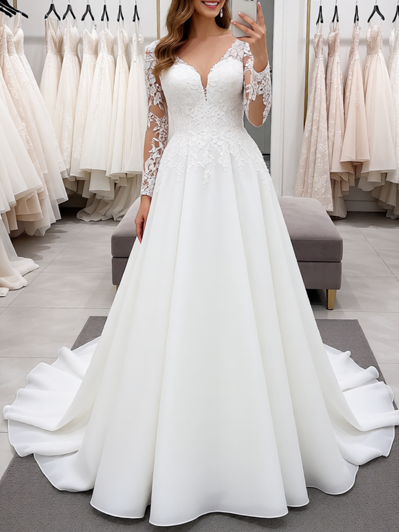 This lace bridal dress features embroidery on the bodice. The long sleeves wedding shower dress has a v-neck and ball gown hem. The white dress for bridal guest is ideal for beach, outdoor wedding or garden wedding guest party.
