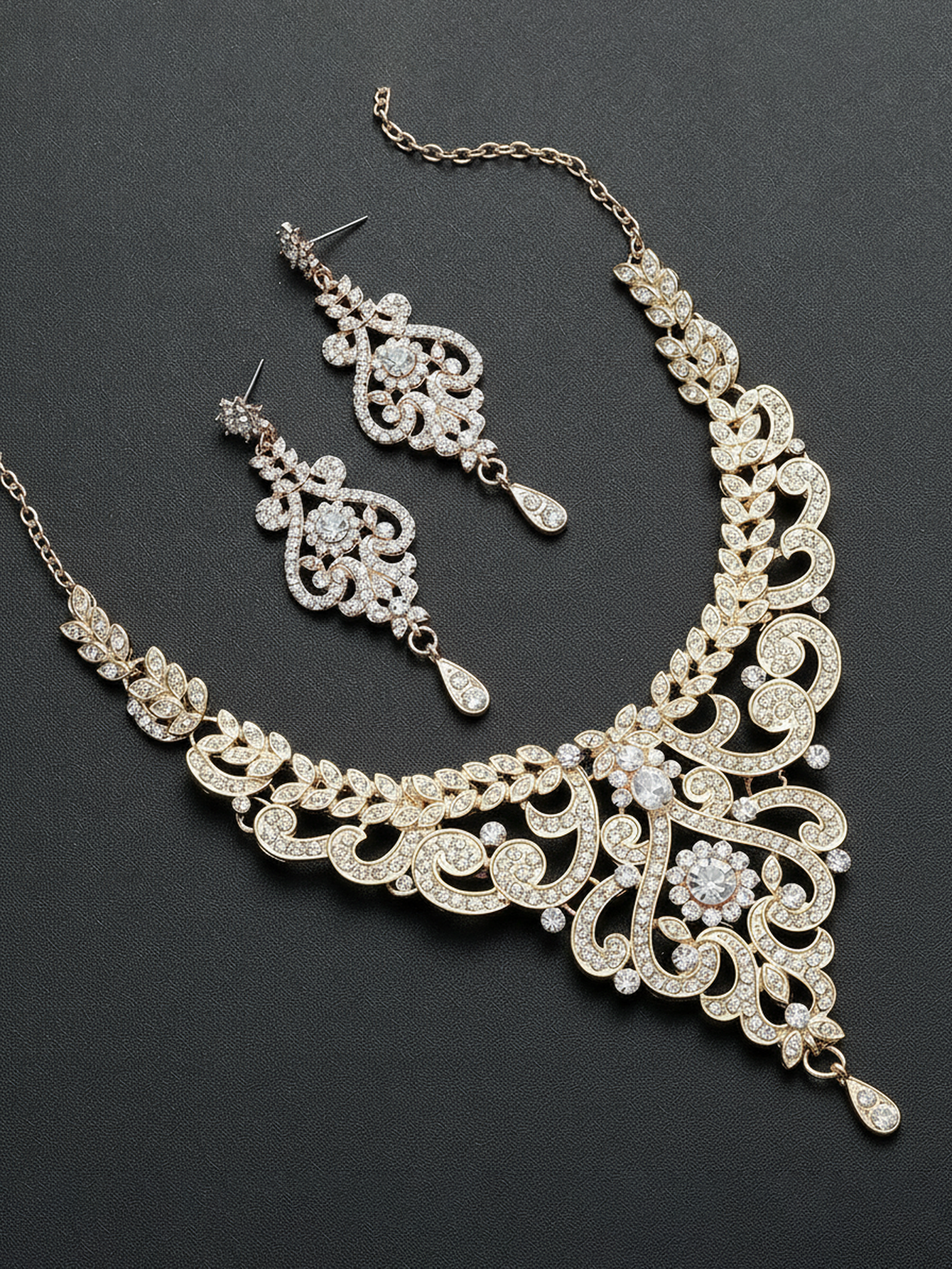 Luxurious Sparkling Crystal And Diamond Necklace and Earring Set - Gold