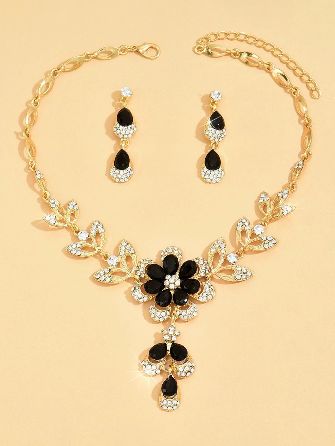 Luxurious Sparkling Floral-Shaped Crystal And Diamond Necklace and Earring Set - Black