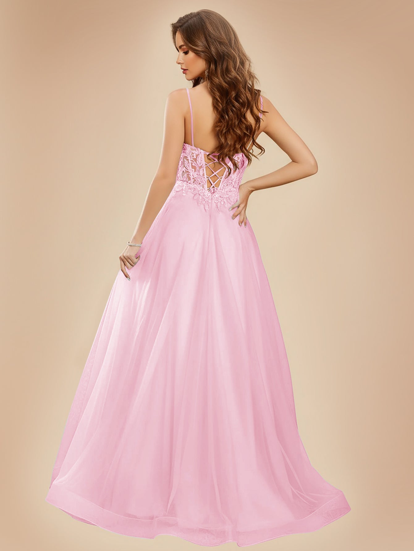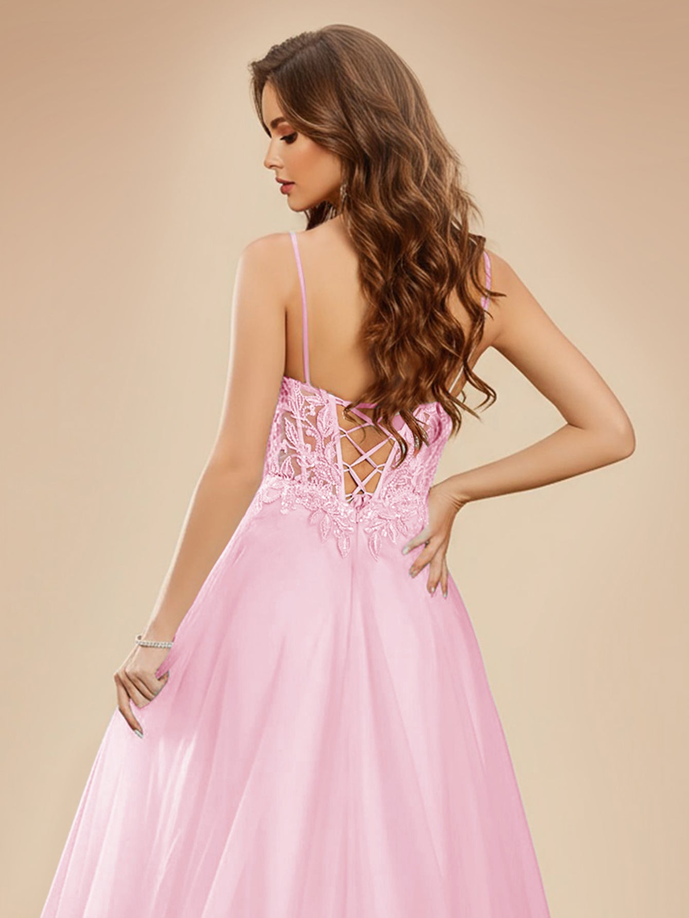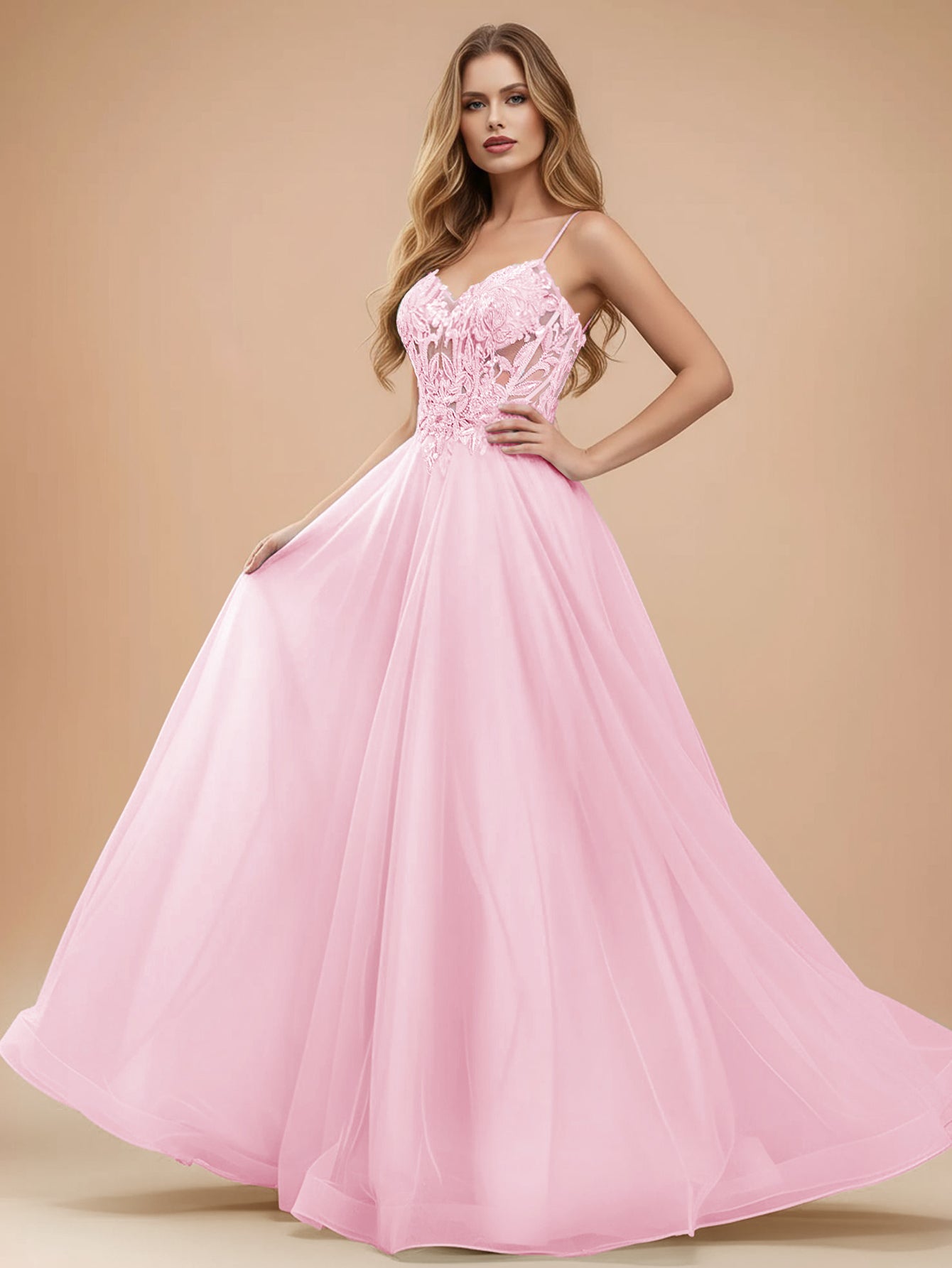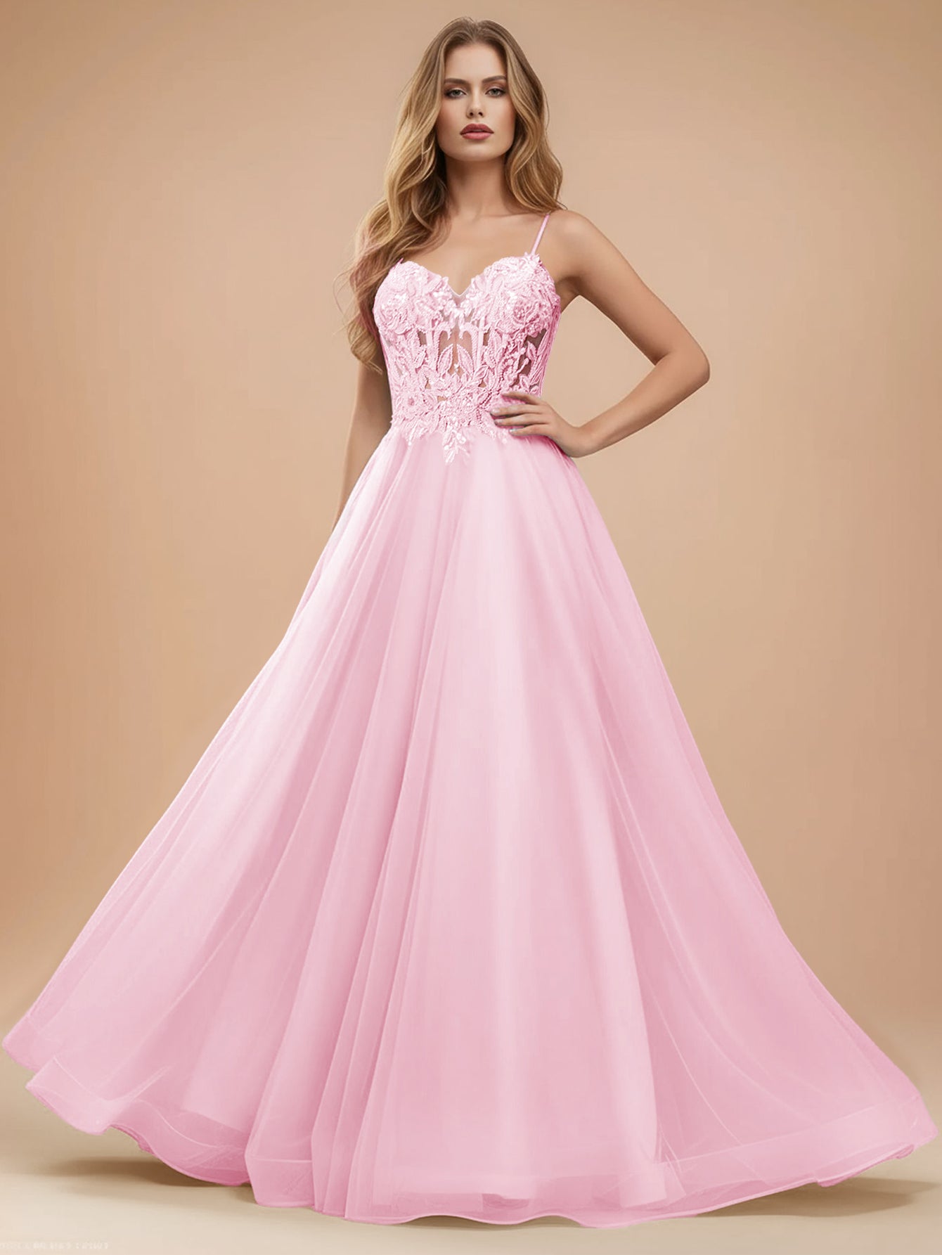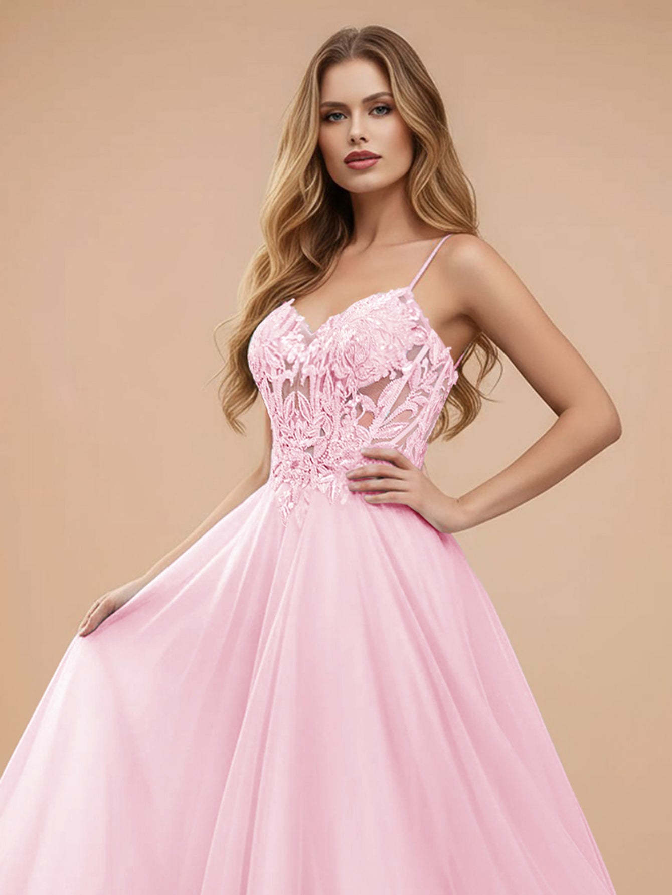 This tulle prom gown features beading on the bodice. The spaghetti straps dress has a sweetheart