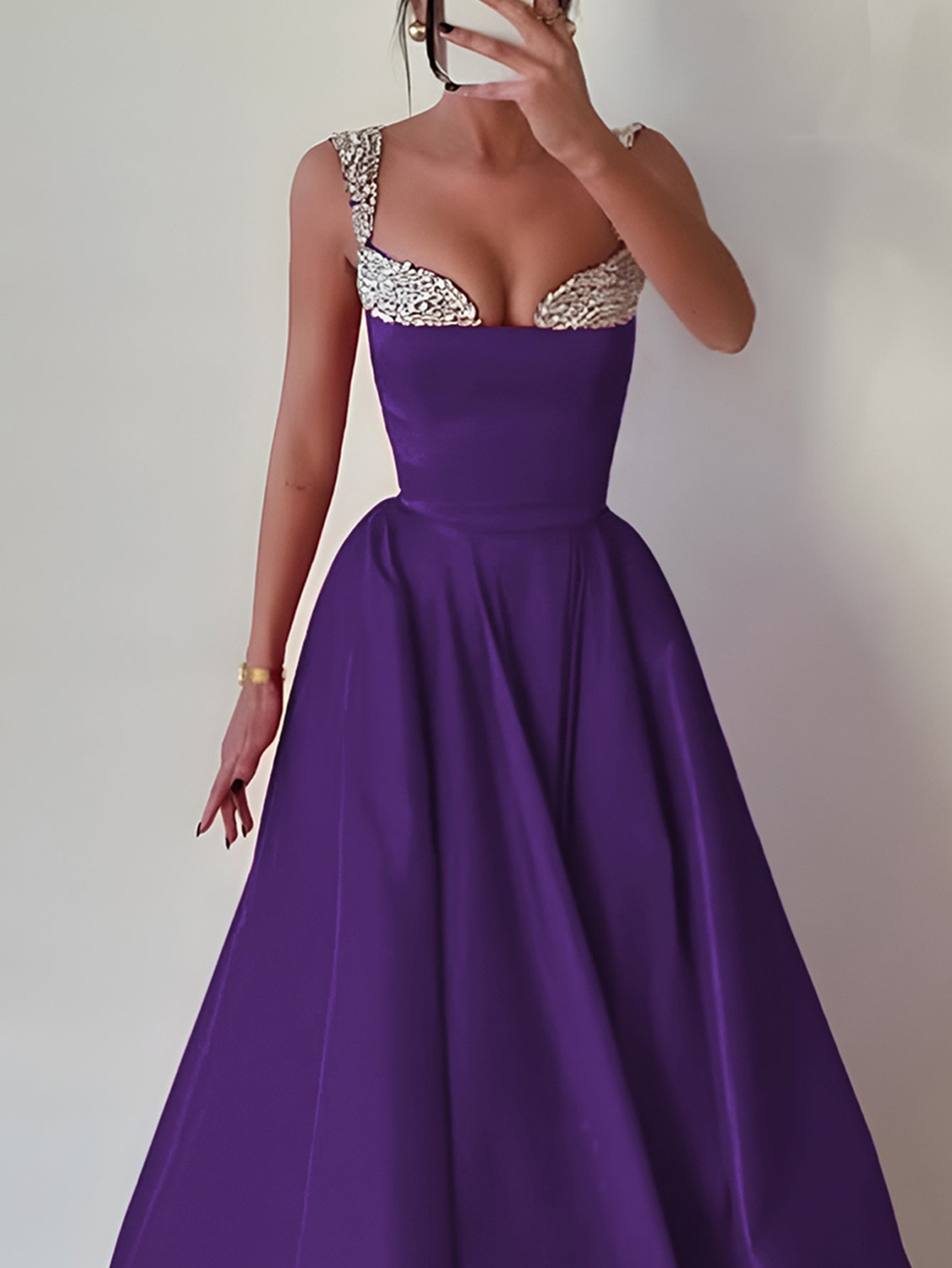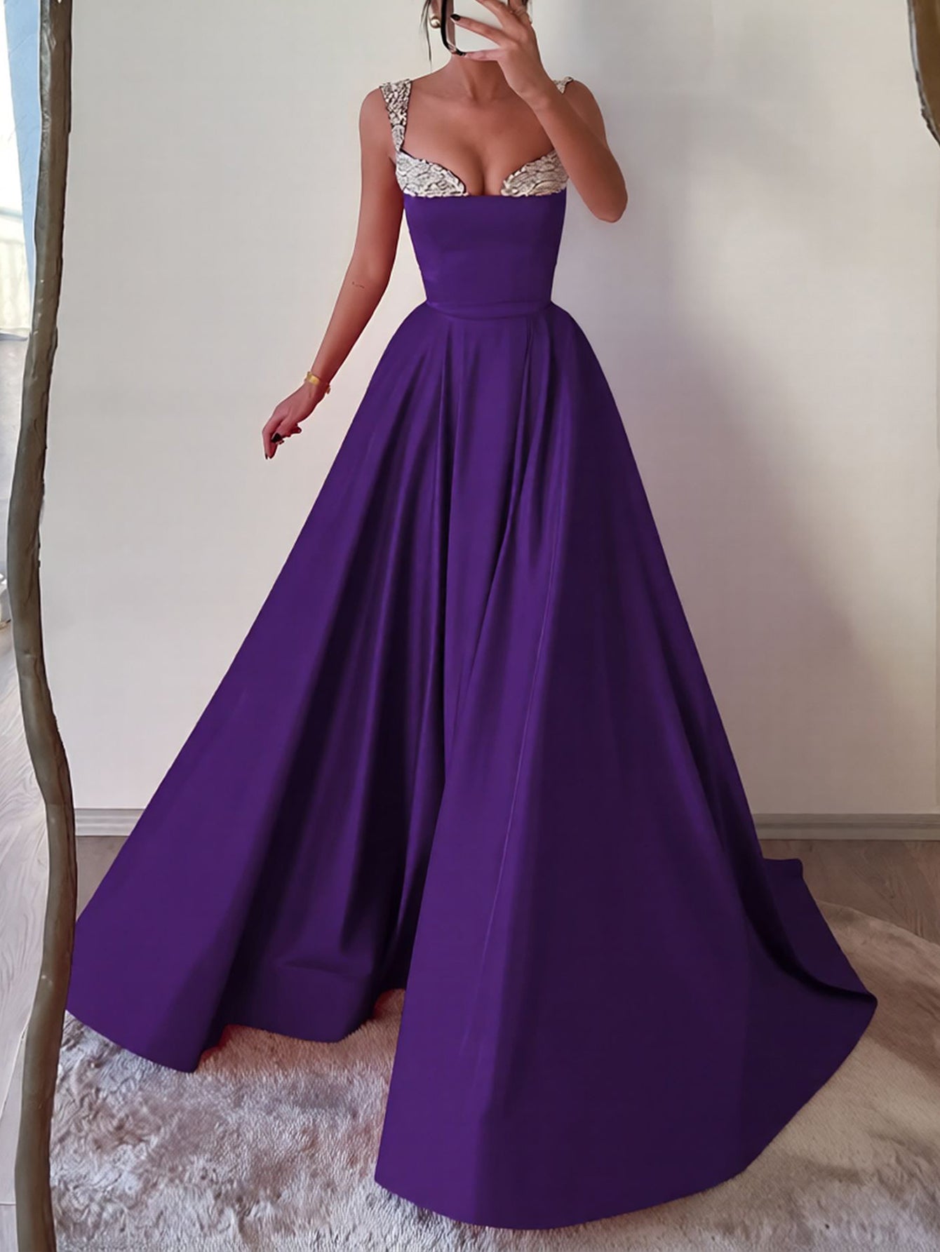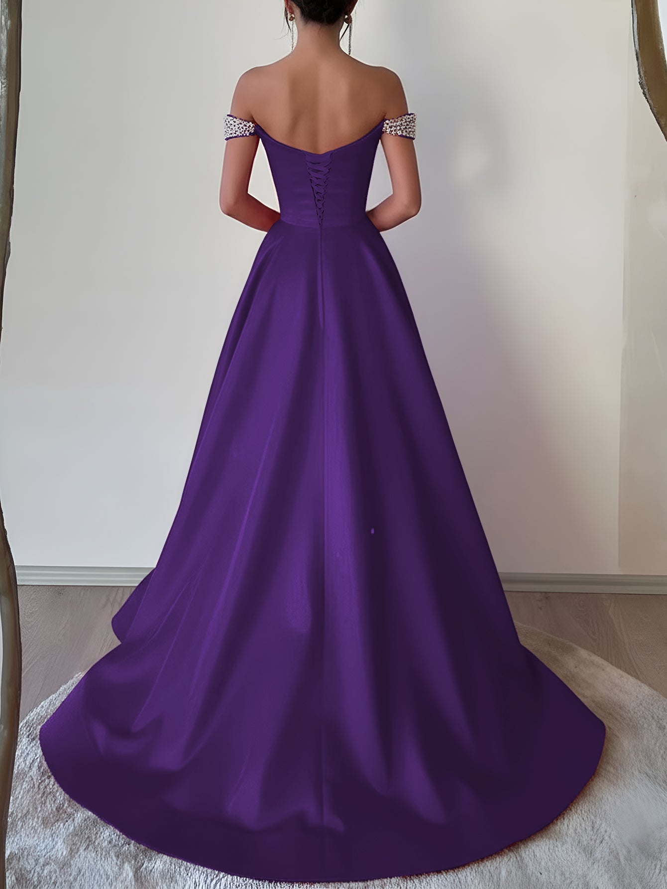 This satin evening dress features crystal bust on the bodice. The off shoulder maxi dress has a sweetheart neckline and pleated hem. Luxury ball gown dresses are ideal for party, evening or festivals.