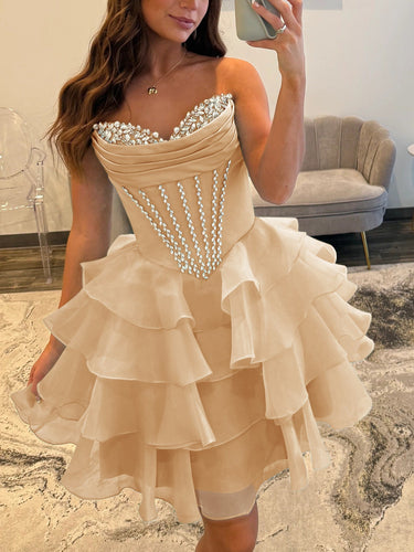 Luxury Crystal Boned Ruffle Mini Ball Gown Prom Dress - Champagne