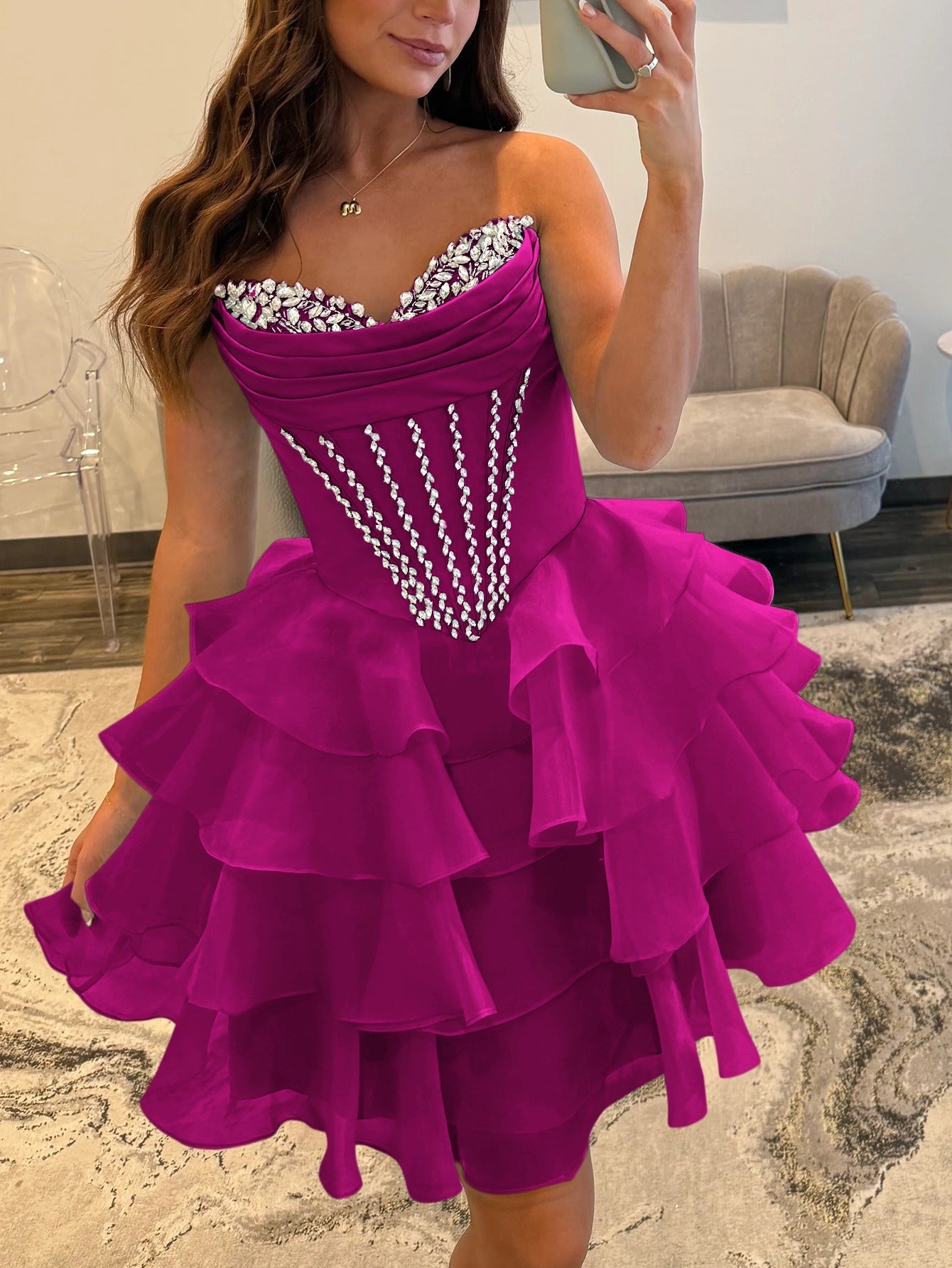 Luxury Crystal Boned Ruffle Mini Ball Gown Prom Dress - Fuchsia