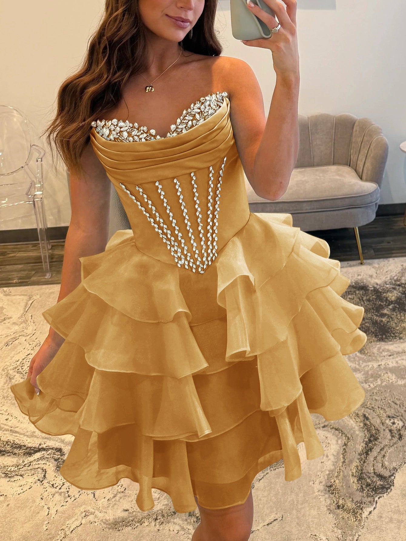 Luxury Crystal Boned Ruffle Mini Ball Gown Prom Dress - Gold