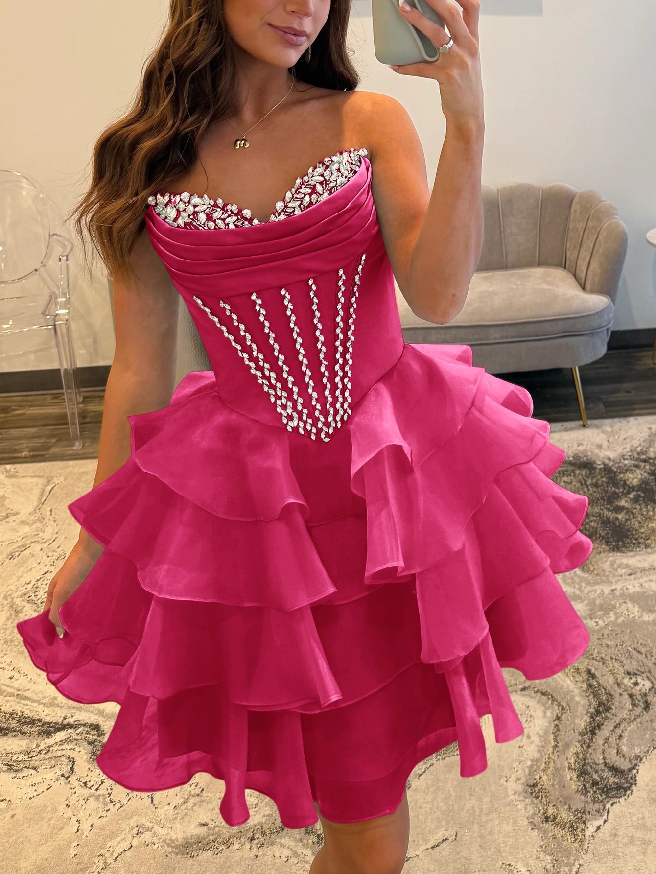 Luxury Crystal Boned Ruffle Mini Ball Gown Prom Dress - Hot Pink
