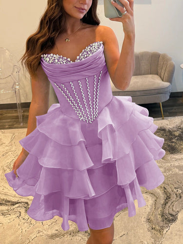 Luxury Crystal Boned Ruffle Mini Ball Gown Prom Dress - Light Purple