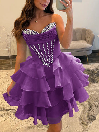 Luxury Crystal Boned Ruffle Mini Ball Gown Prom Dress - Purple