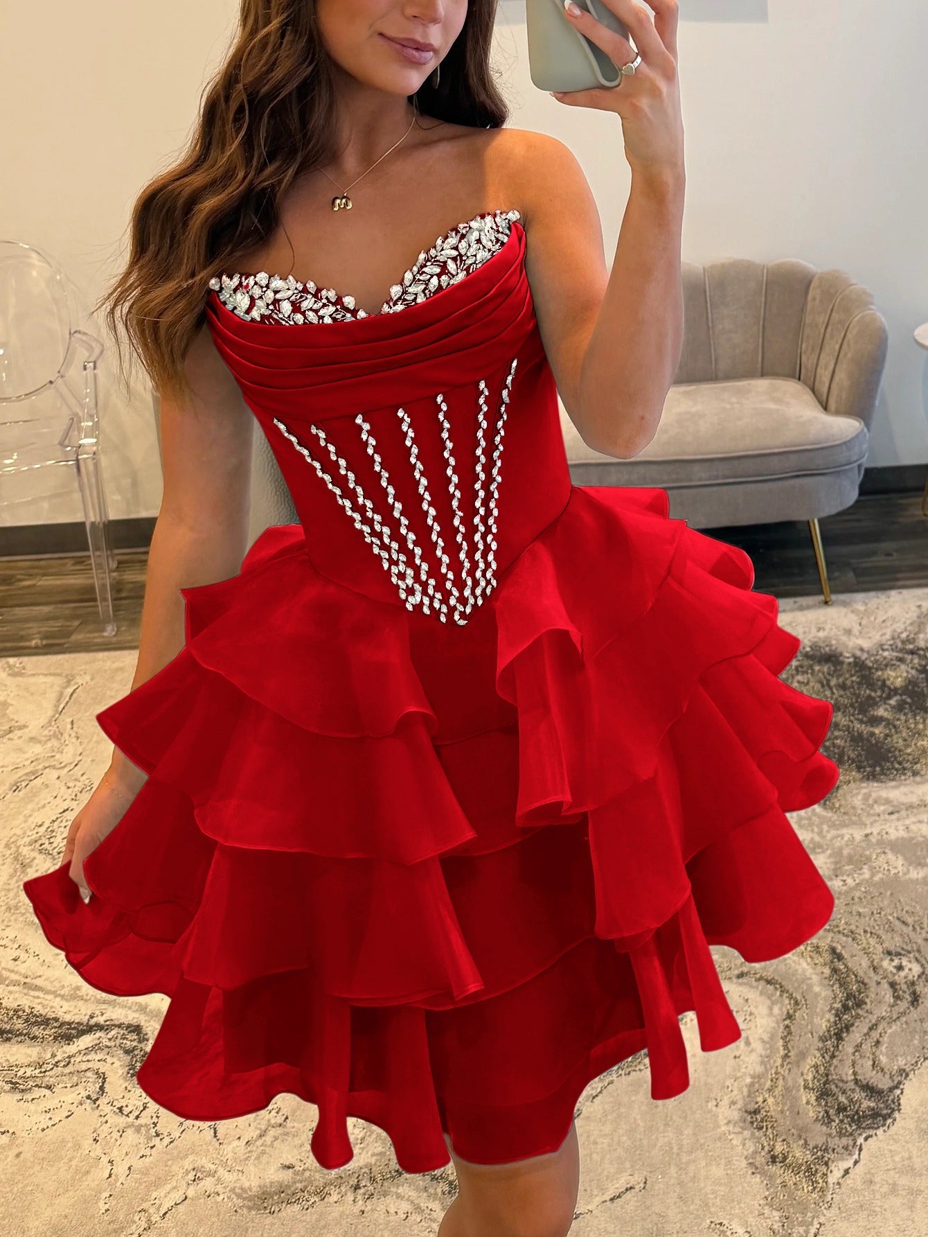 Luxury Crystal Boned Ruffle Mini Ball Gown Prom Dress - Red