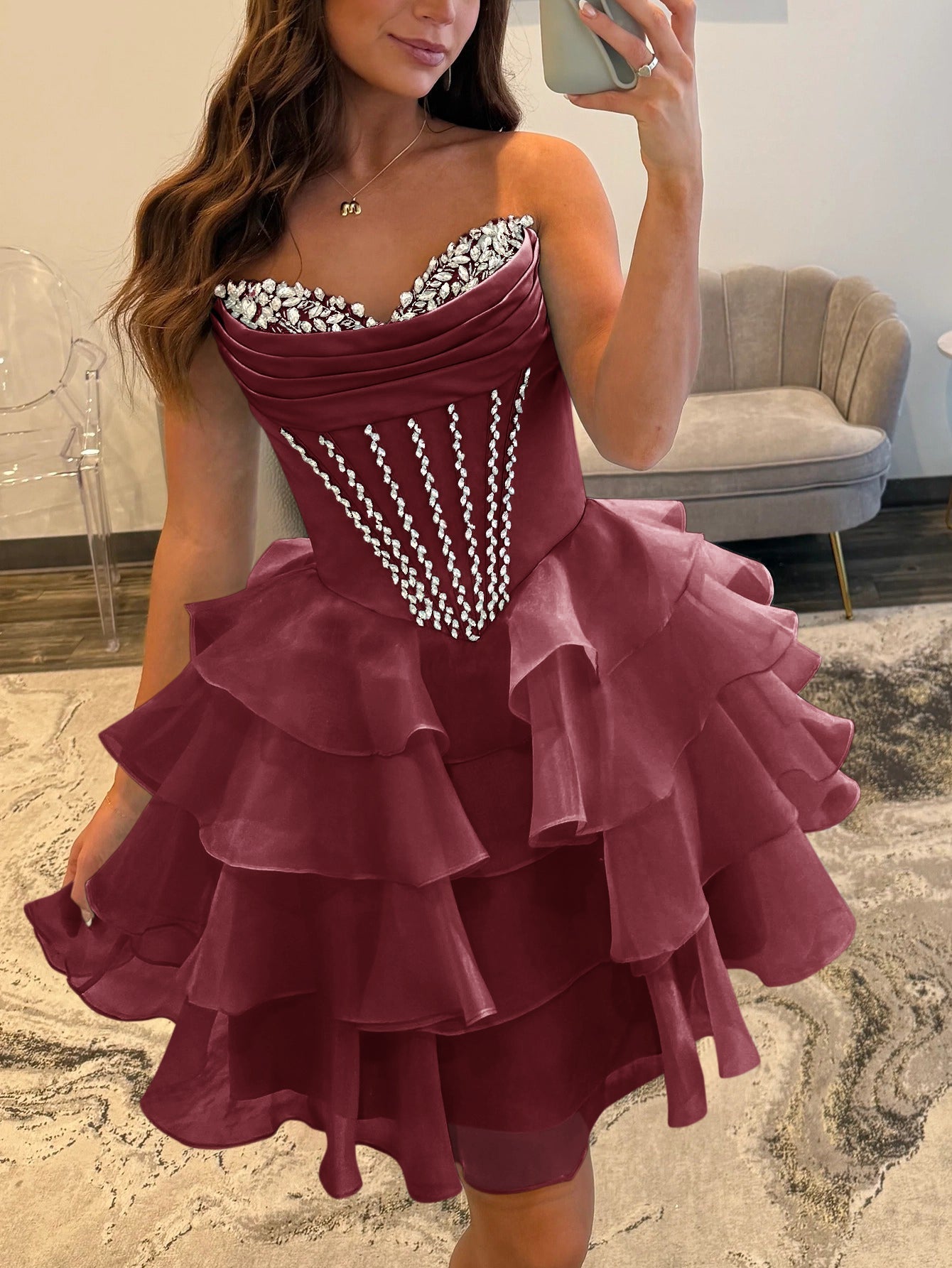 Luxury Crystal Boned Ruffle Mini Ball Gown Prom Dress - Watermelon Red
