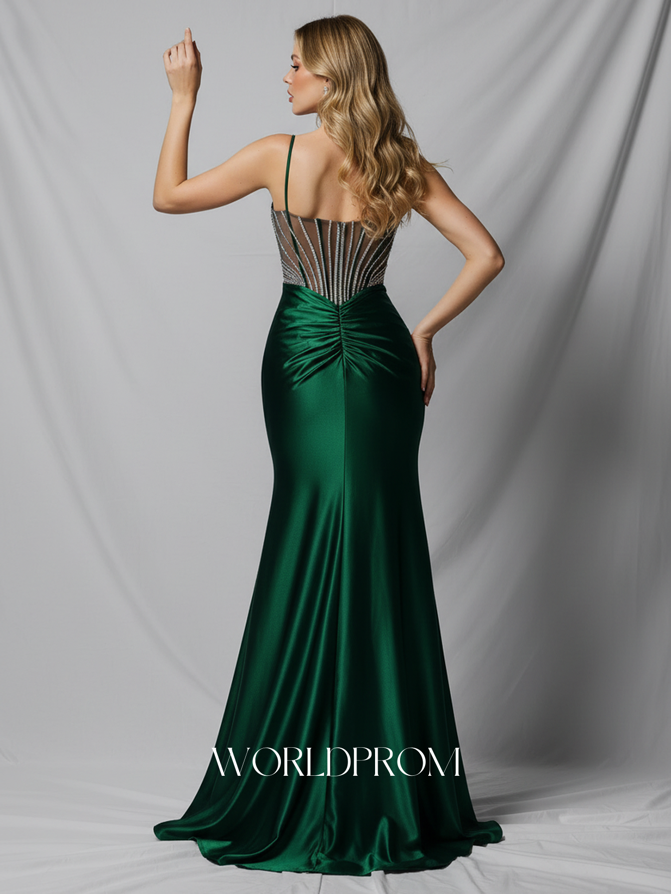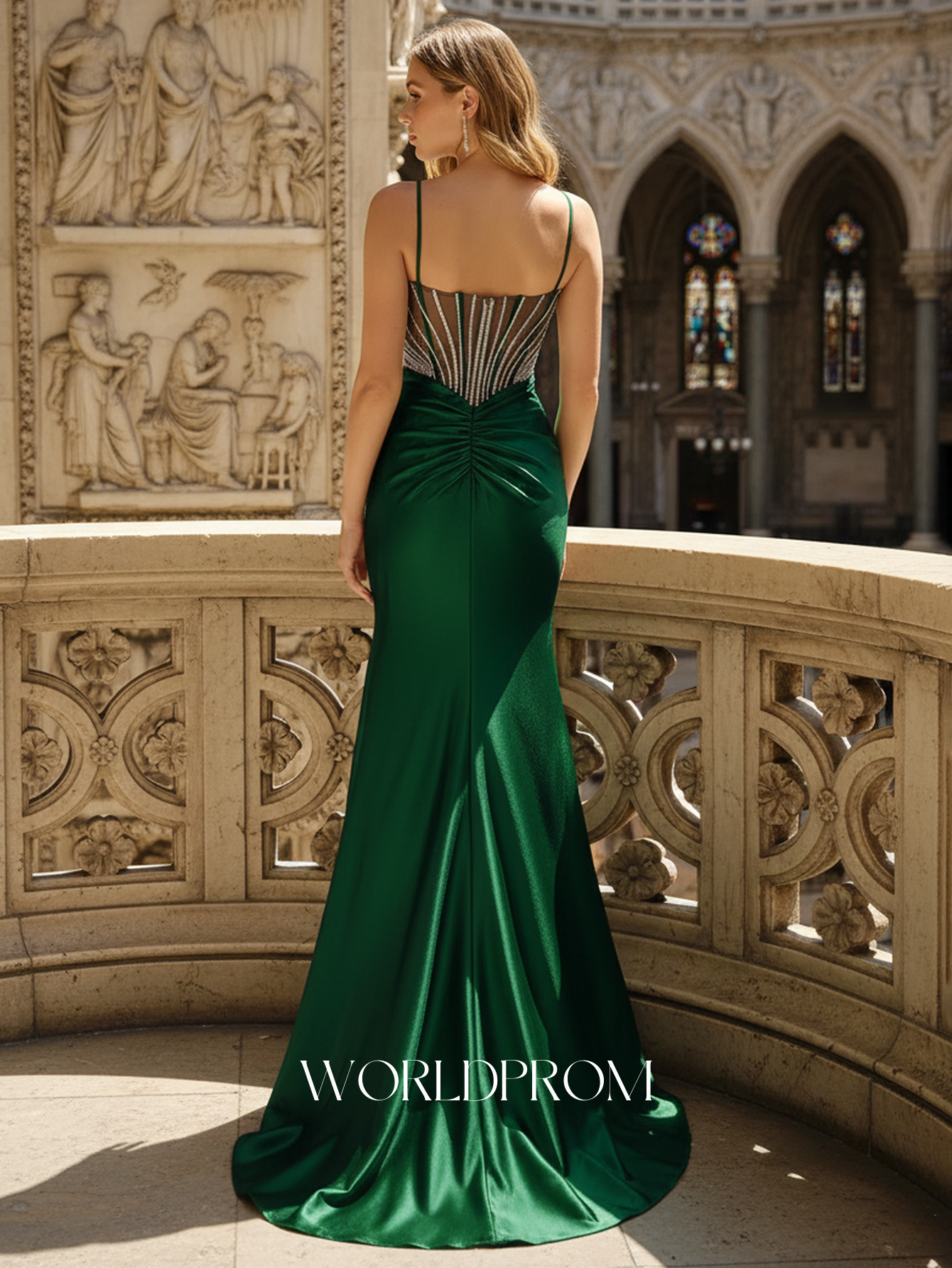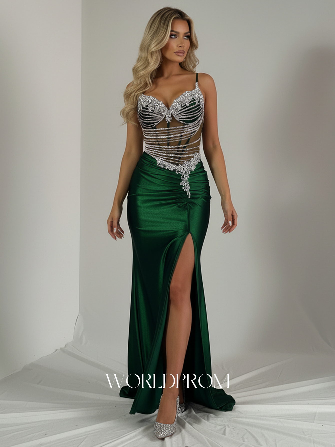 Luxury Crystal Dubai Sheer Bodice Mermaid Evening Dress - Emerald Green