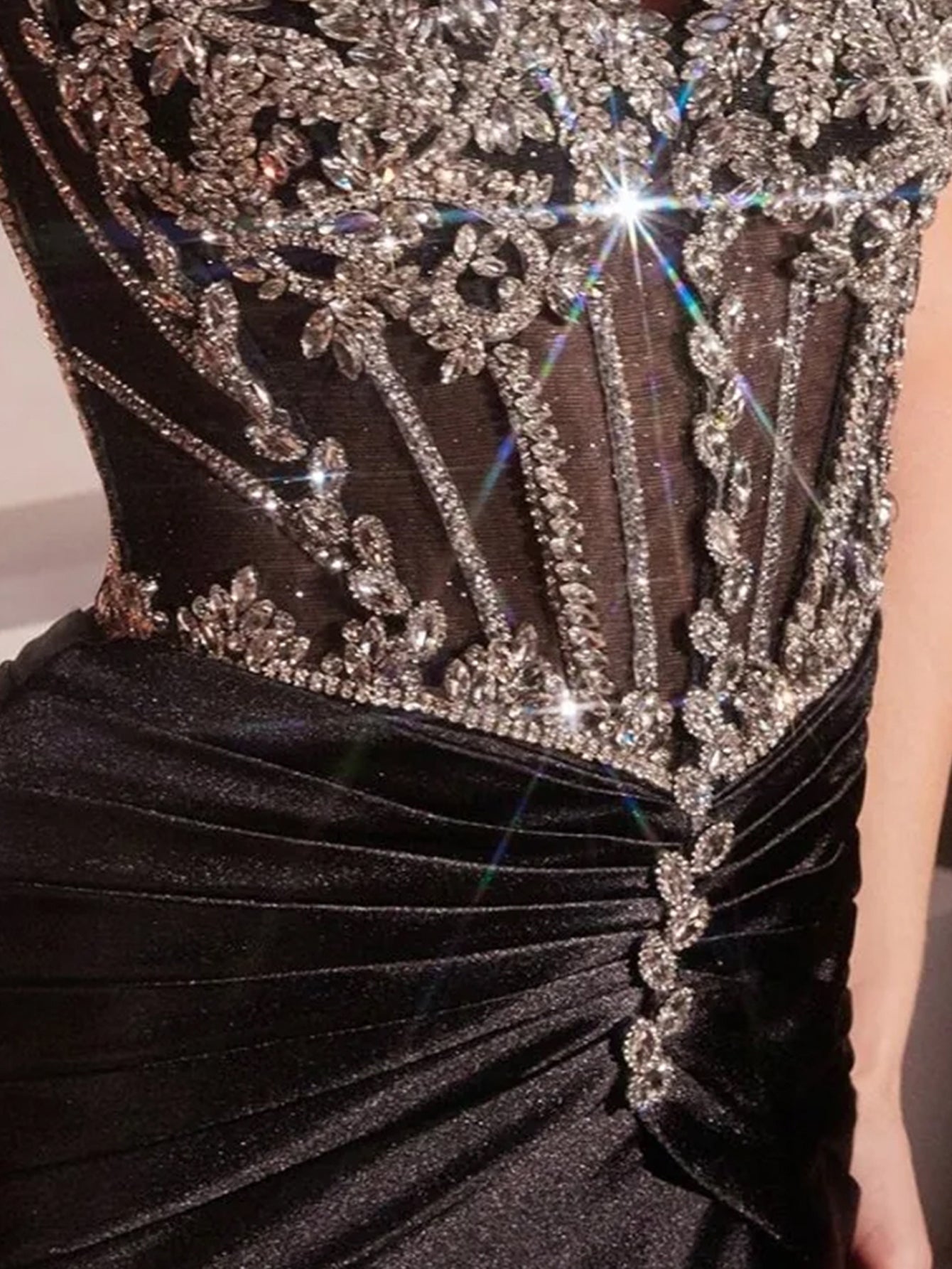 Details: Backless, Crystal, Ruched, Illusion, Beading