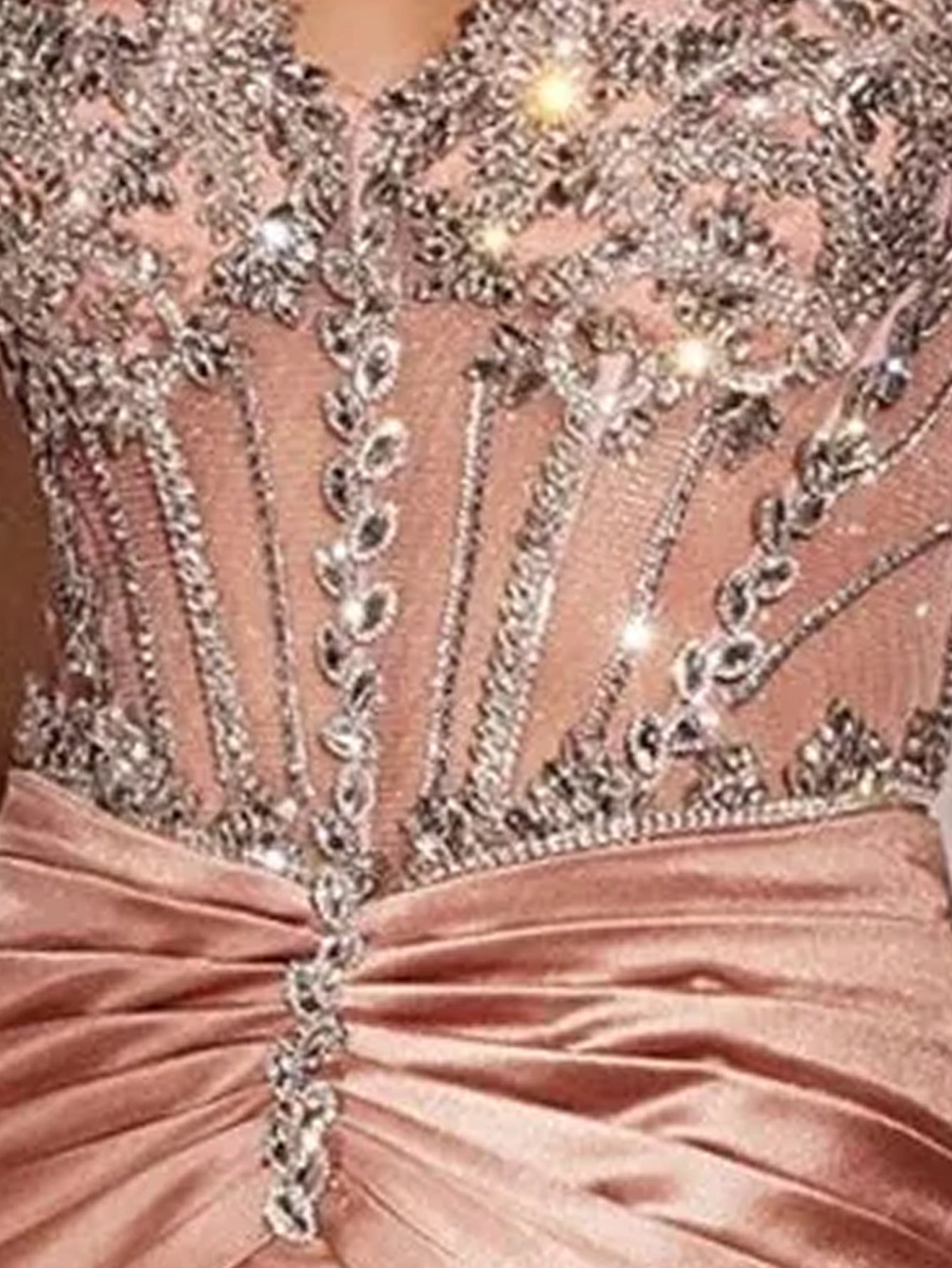 Luxury Crystal Illusion Bodice Mermaid Long Prom Dress - Rose Gold
