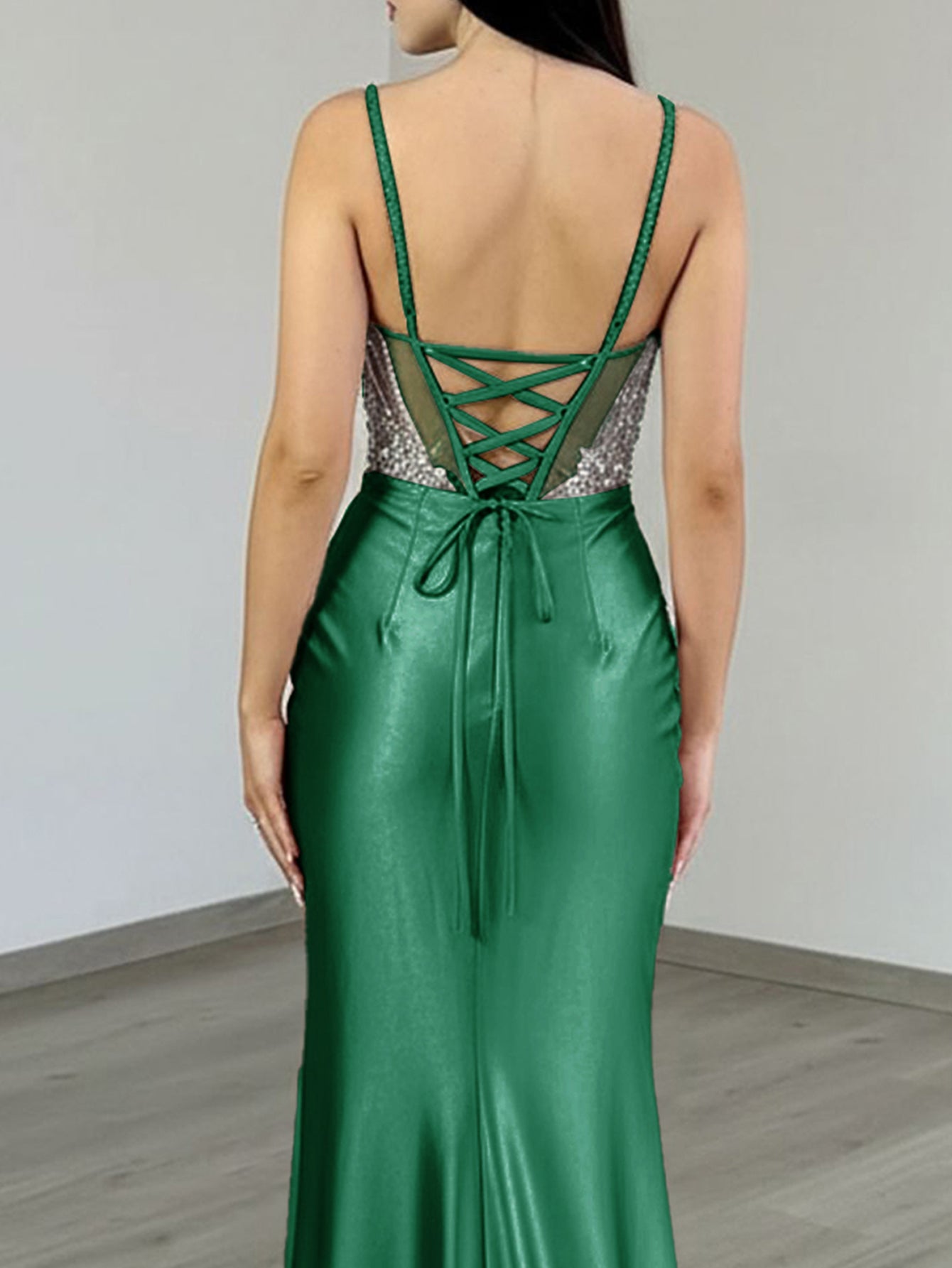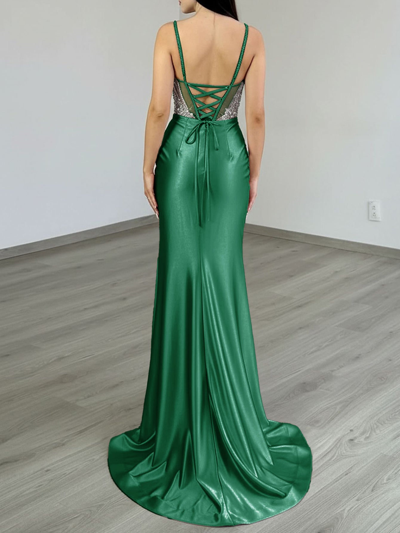 Details: Backless, Lace Up, Crystals, Split, Illusion, Sheer, Pleated