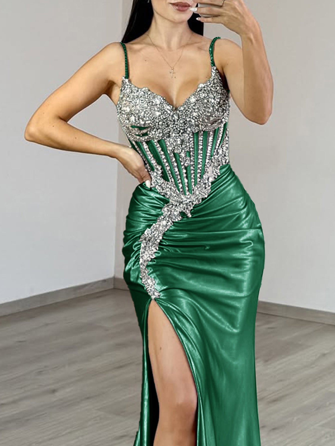Luxury Crystal Illusion Mermaid Long Prom Dress - Emerald Green