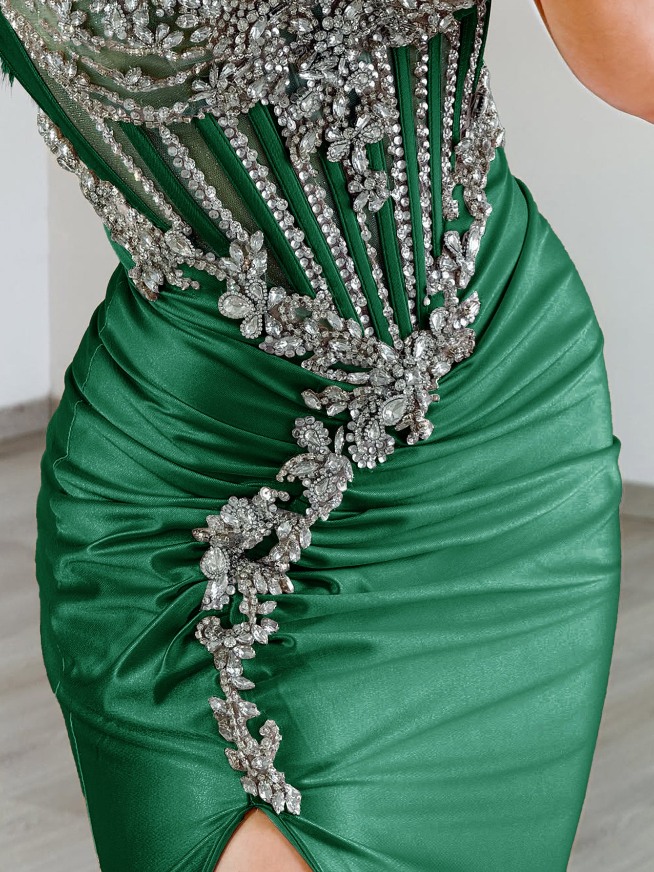 This stretch satin evening dress features ruched waist with crystals on the illusion bodice. The strapless boned maxi dress has a V-neck and split hem. Luxury mermaid dresses are ideal for party, evening or festivals.