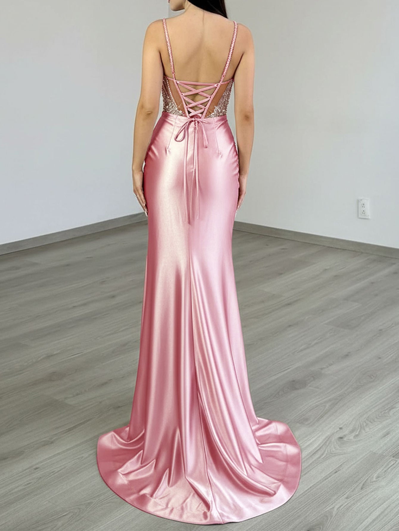Details: Backless, Lace Up, Crystals, Split, Illusion, Sheer, Pleated