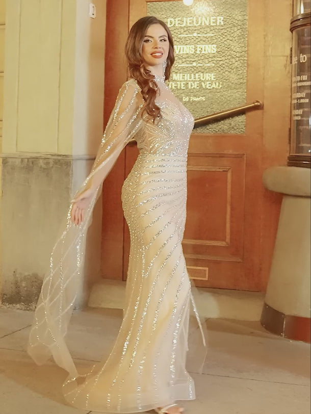 Luxury Crystal Long Sleeve Dubai Mermaid Evening Dress - Champagne